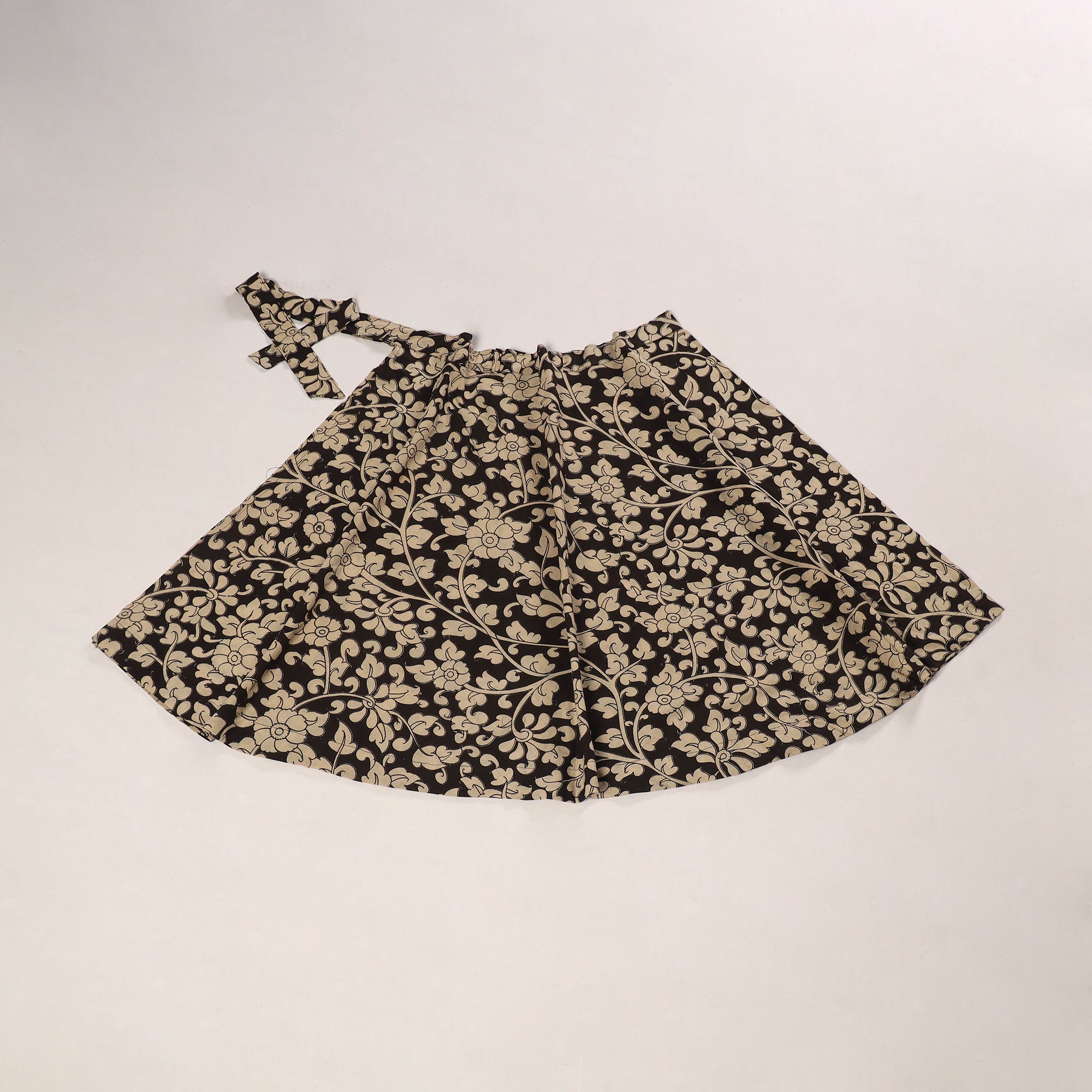 Bring an artistic flair to your style with this black kalamkari inspired cotton wrap skirt. The adjustable tie-up waist ensures ease and comfort, while its flowing silhouette highlights ethnic charm. Featuring with detailed screen-printed motifs vines, florals, and folk motifs inspired by kalamkari traditions, it suits everyday dressing, travel wardrobes, and casual festive looks.
