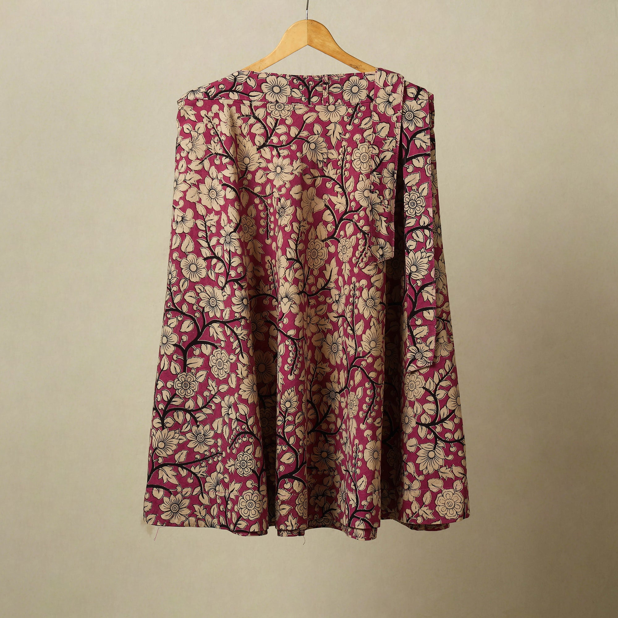 Bring an artistic flair to your style with this pink kalamkari inspired cotton wrap skirt. The adjustable tie-up waist ensures ease and comfort, while its flowing silhouette highlights ethnic charm. Featuring with detailed screen-printed motifs vines, florals, and folk motifs inspired by kalamkari traditions, it suits everyday dressing, travel wardrobes, and casual festive looks.