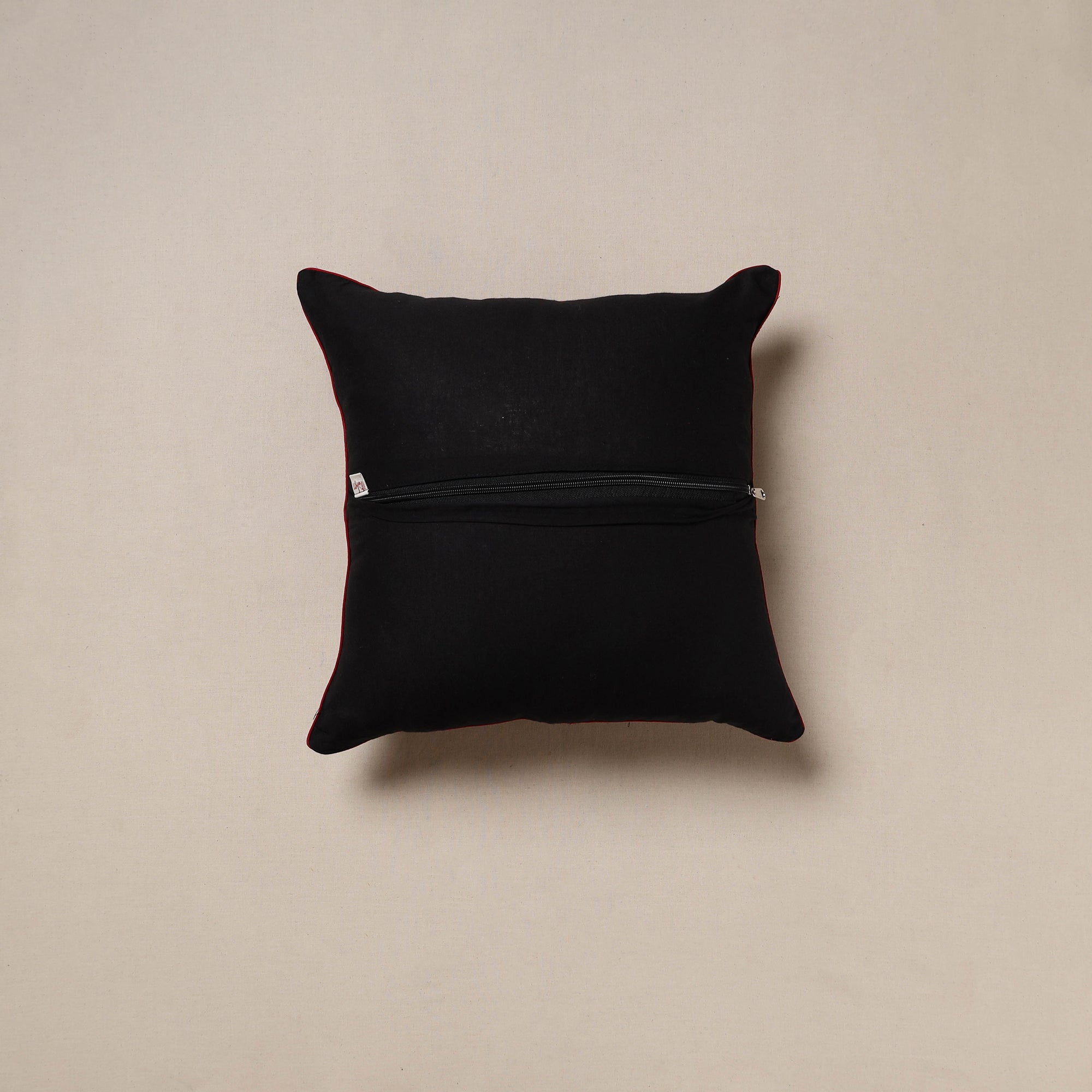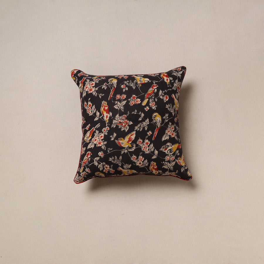 | Material | Black kalamkari print cushion cover. Place this cushion cover on any furniture of your choice, such as your bed, sofa or a special chair. Made from pure cotton using kalamkari screen printing technique. This cover is designed with a zipper closure, blending functionality with the beauty of Indian textiles. |