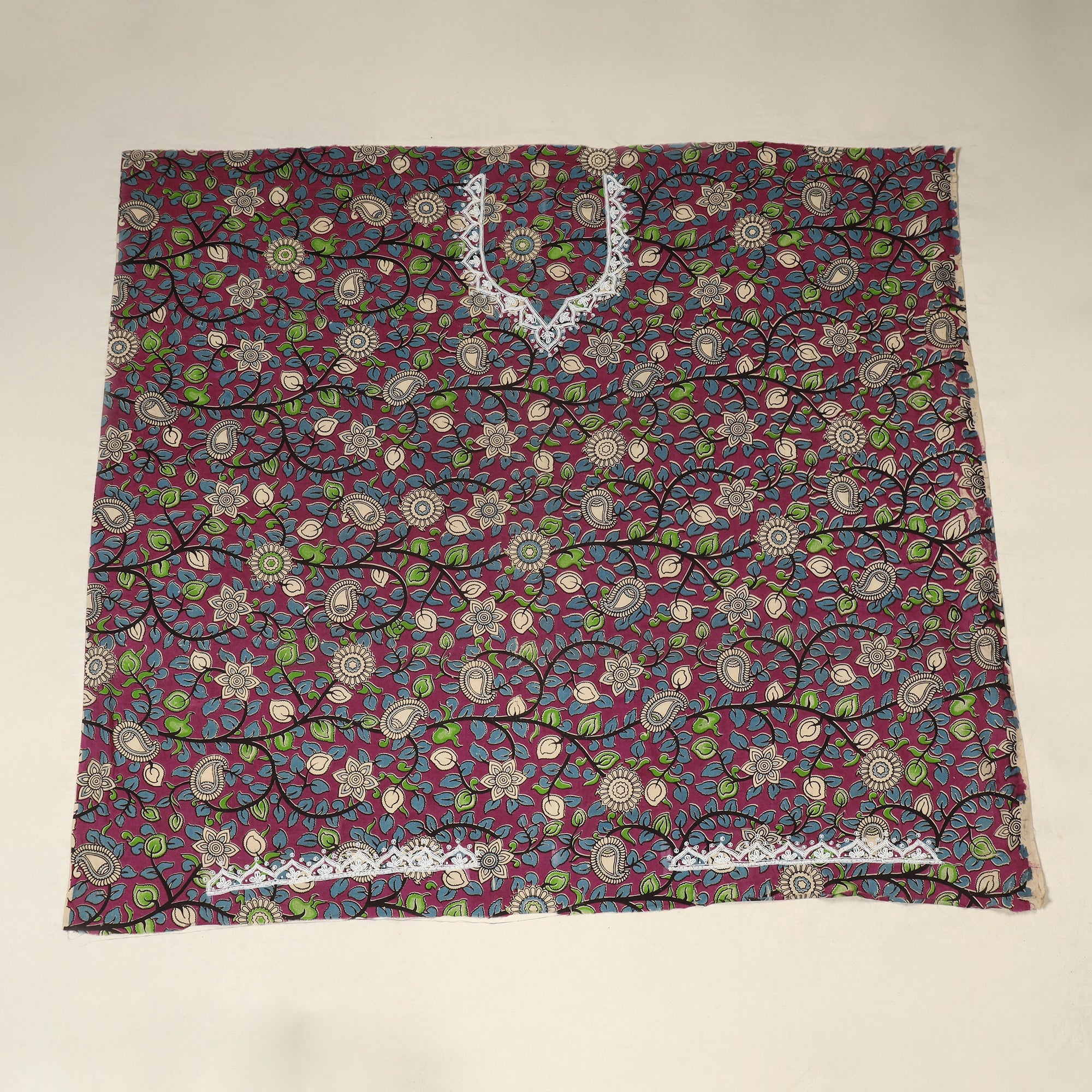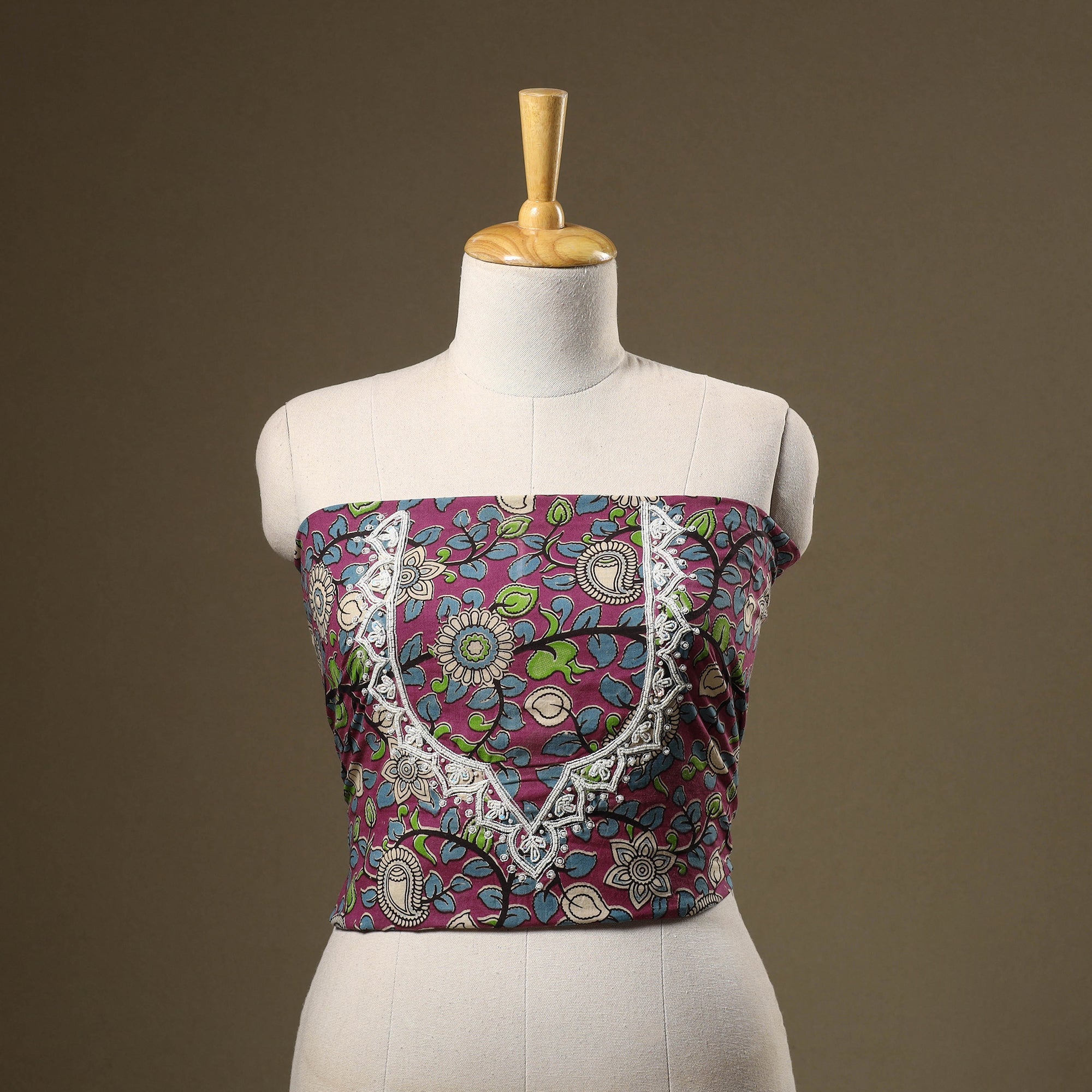 This handcrafted blouse piece showcases hand embroidery on traditional kalamkari screen print fabric, blending artisanal beauty with everyday comfort. Perfect for pairing with sarees, it adds a refreshing touch to both festive looks and daily wear. The breathable cotton fabric ensures ease and elegance all day long.