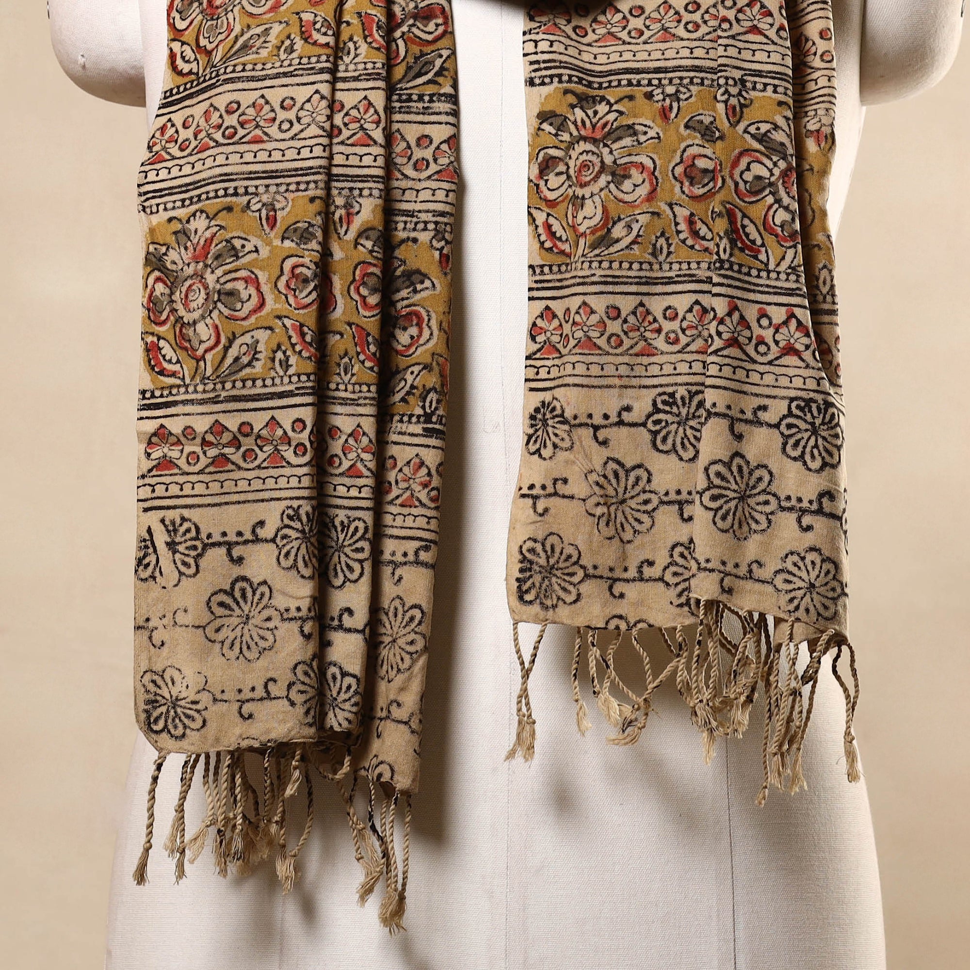 Add elegance to your wardrobe with this yellow cotton mangalagiri stole, naturally dyed and adorned with intricate kalamkari block prints. Woven in the East Godavari and Krishna districts of Andhra Pradesh, this lightweight stole carries the rich legacy of traditional textile art. Soft and breathable, it’s perfect for layering over kurtas or casuals.