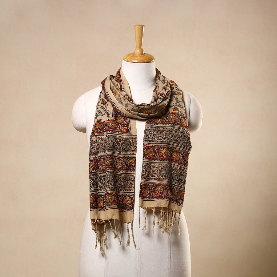 Add elegance to your wardrobe with this beige cotton mangalagiri stole, naturally dyed and adorned with intricate kalamkari block prints. Woven in the East Godavari and Krishna districts of Andhra Pradesh, this lightweight stole carries the rich legacy of traditional textile art. Soft and breathable, it’s perfect for layering over kurtas or casuals.