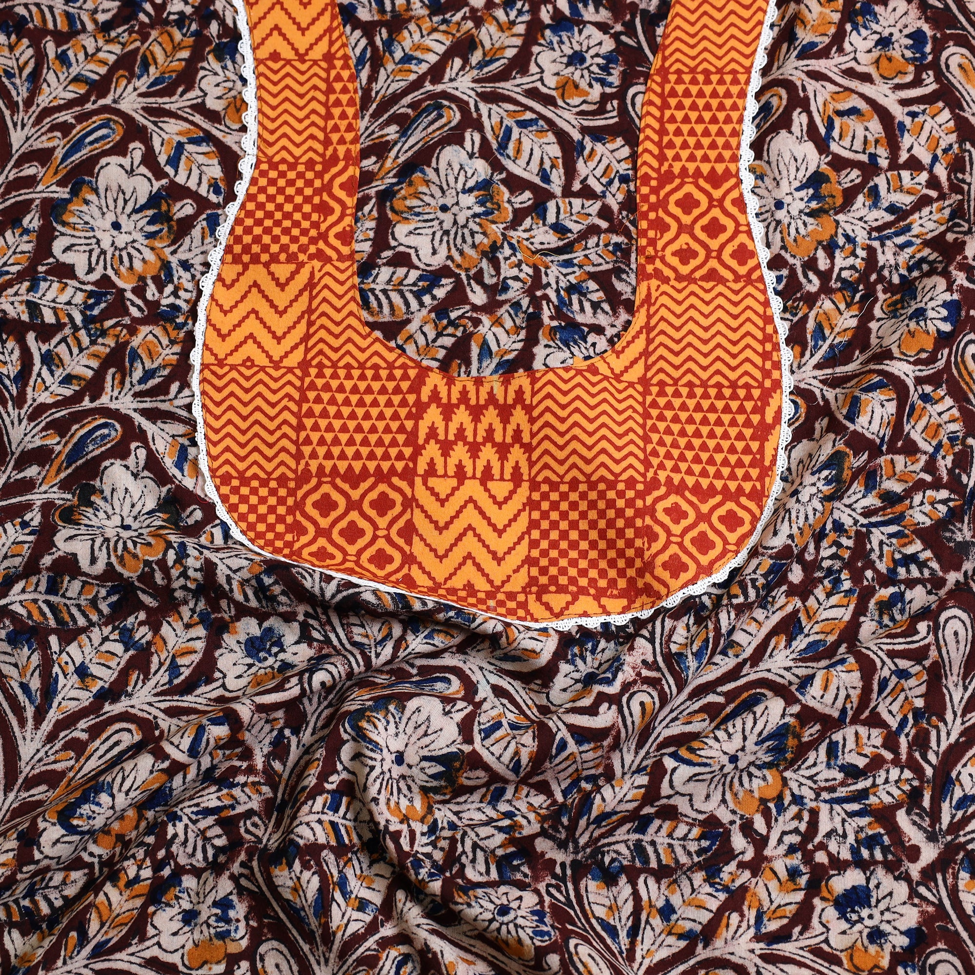 Elevate your wardrobe with this brown kalamkari print patchwork cotton fabric. Featuring intricate block printing method and crafted from lightweight cotton, it beautifully captures India’s cultural richness. Ideal for stitching custom kurtas that blend comfort and tradition.