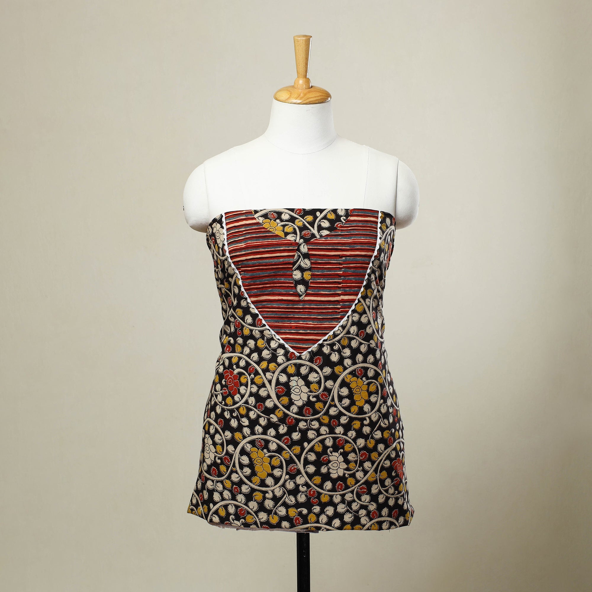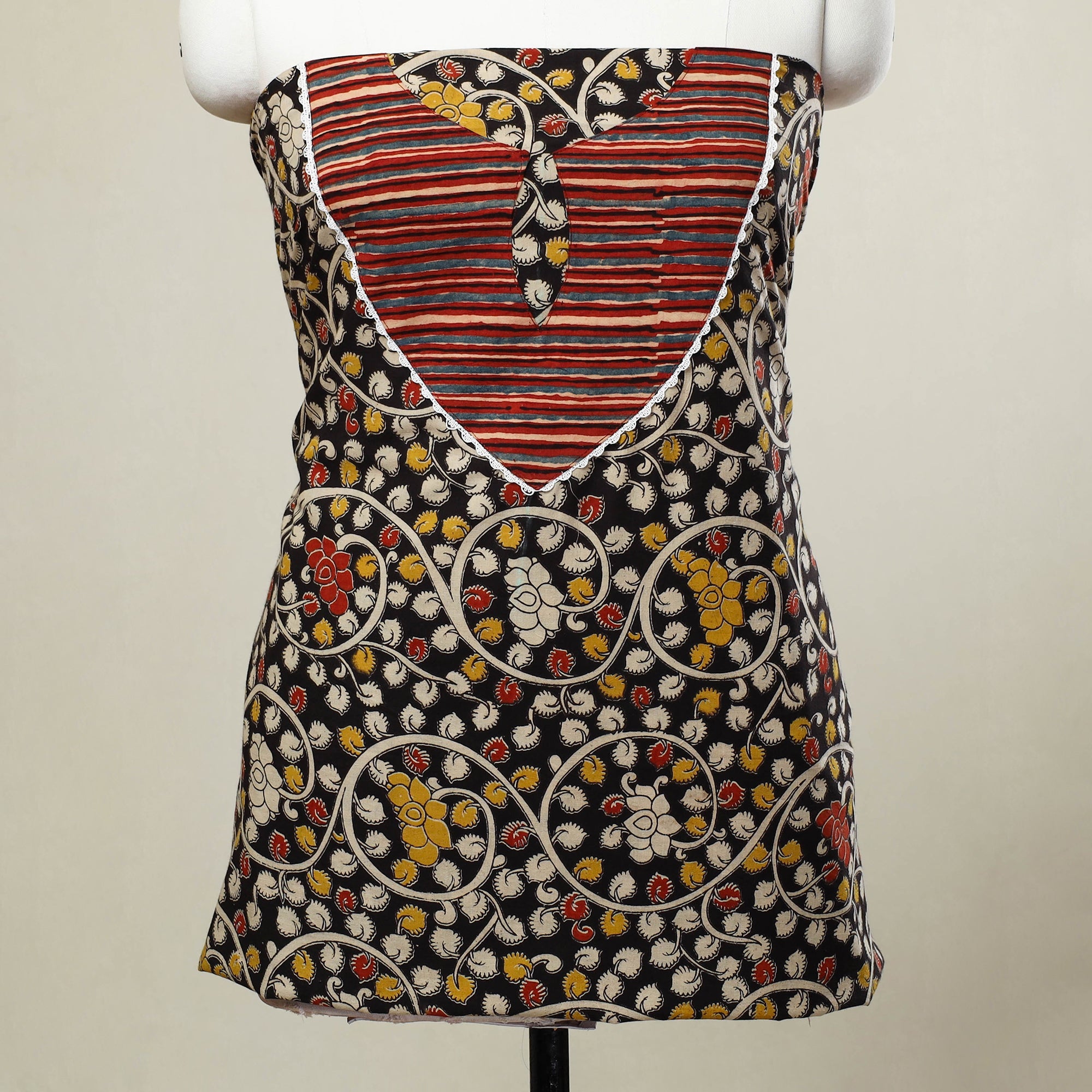 This black kalamkari print patchwork cotton kurta material showcases intricate screen-printed technique. Made from soft, breathable cotton, it features vibrant, detailed patterns inspired by the rich cultural heritage of India. Ideal for creating custom kurtas, this fabric offers both comfort and elegance
