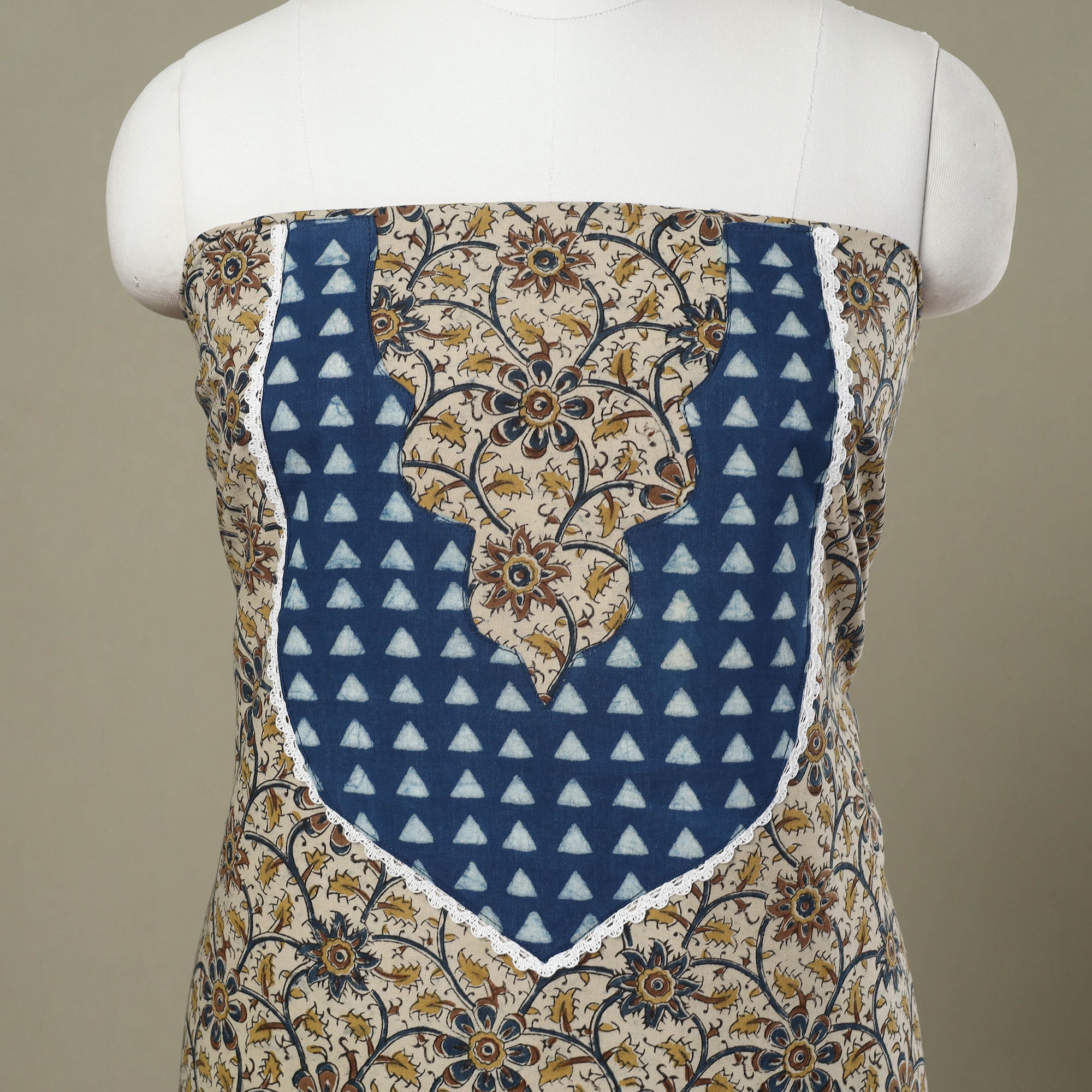 Infuse timeless charm into your wardrobe with this beige kalamkari print patchwork cotton kurta material. Showcasing detailed patterns through traditional block printing, it reflects India's vibrant artistic traditions. Crafted from soft, breathable cotton, it offers the perfect balance of comfort, culture, and contemporary style for your custom kurtas.