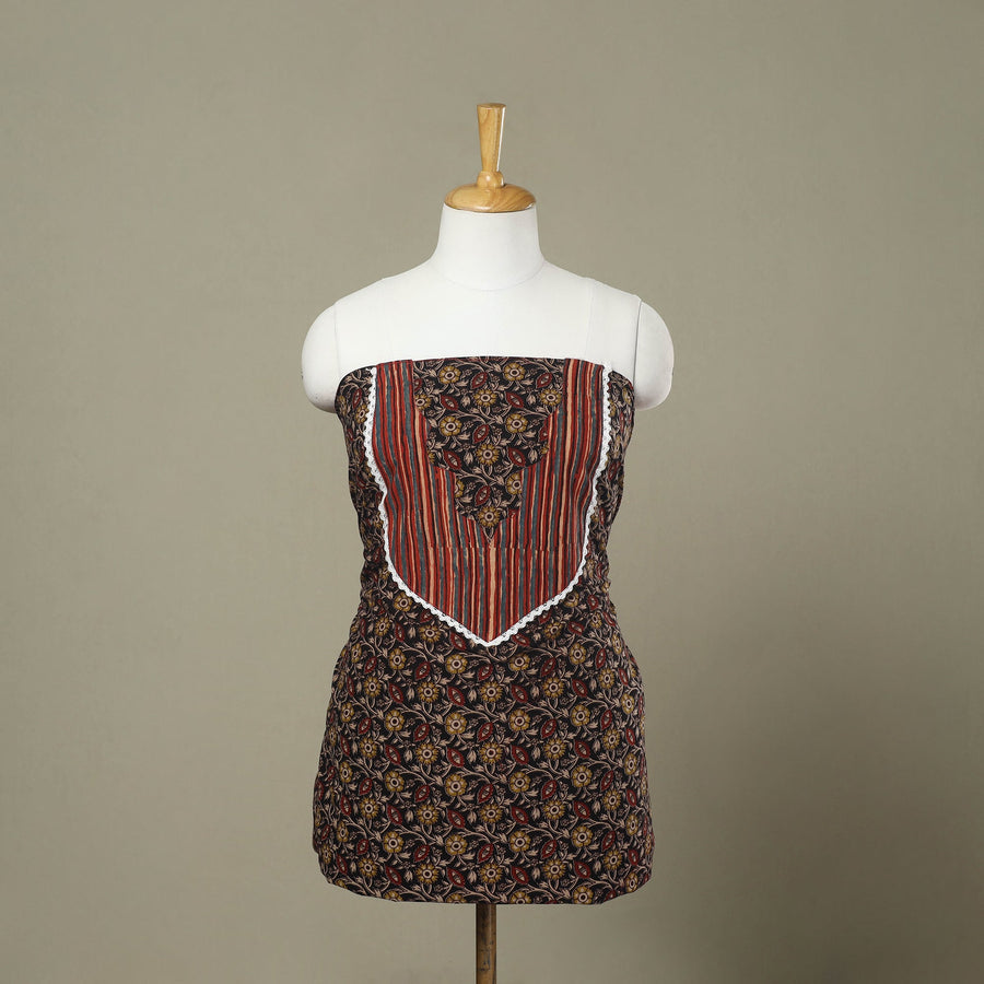This black kalamkari print patchwork cotton kurta material is crafted using the screen printing technique. It features intricate, vibrant patterns that showcase India's rich artistic heritage. Made from soft, breathable cotton, this fabric is perfect for creating custom kurtas that combine comfort, style, and cultural elegance.