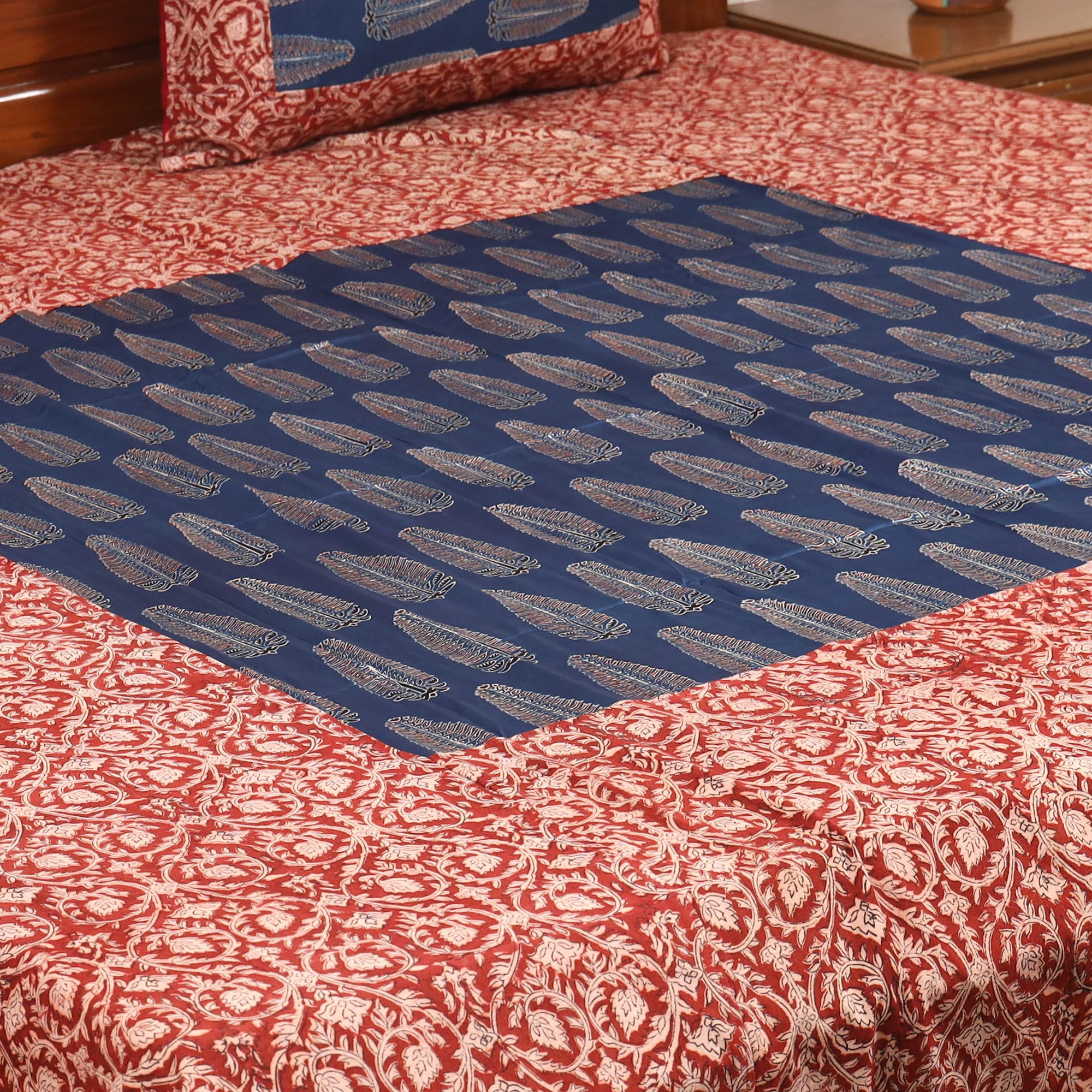 This red cotton bedsheet set showcases a beautiful fusion of kalamkari and ajrakh block prints, combining two rich Indian textile traditions in one elegant design. Crafted from breathable cotton, it offers lasting comfort and durability. The intricate patterns bring a handcrafted charm to your space. The set includes one double bedsheet and two matching pillow covers, ideal for elevating your home décor.