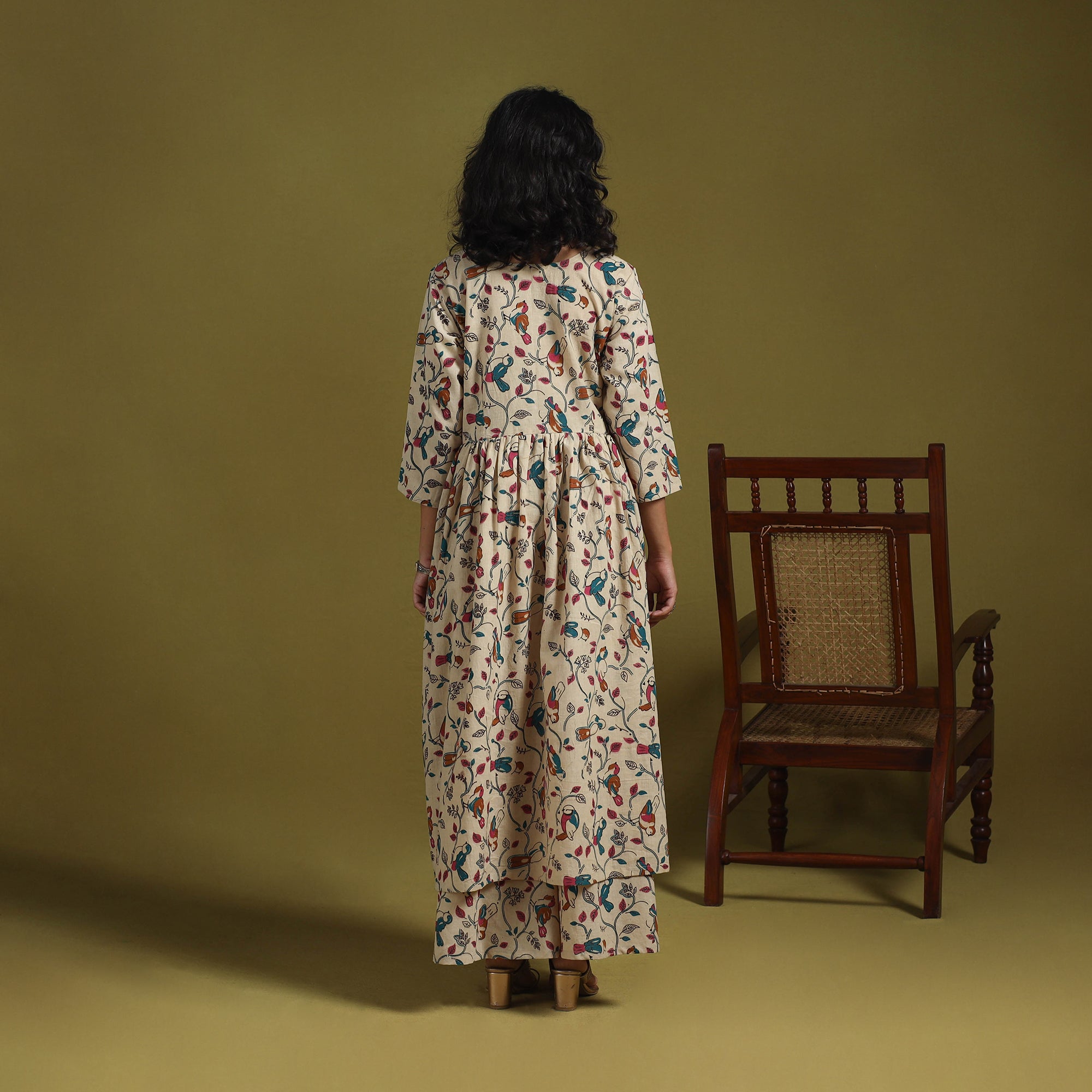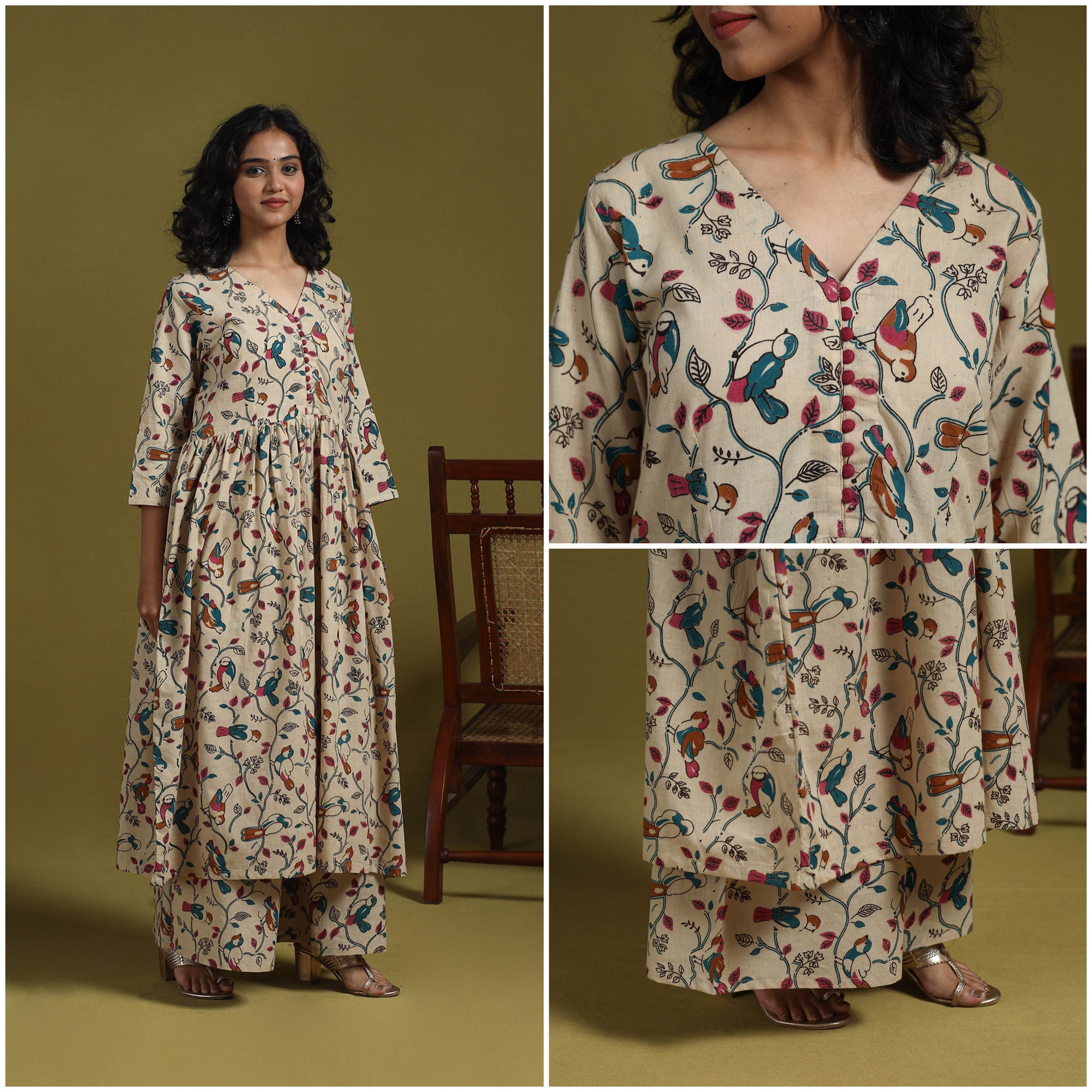 Kalamkari printed 100% pure cotton 2pc kurta set is designed for everyday comfort. The flared kurta comes with an elasticated palazzo that allows easy movement. The screen printed patterns inspiration from traditional Kalamkari art. Ideal for office wear, casual outings, or small festive moments, it offers a balanced and elegant look.