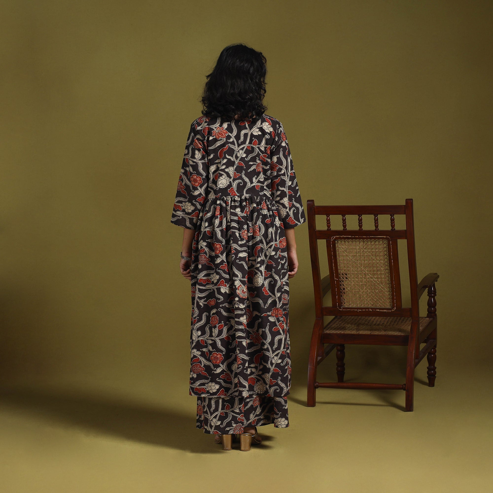 Black kalamkari printed 100% pure cotton 2pc kurta set is designed for everyday comfort. The flared kurta comes with an elasticated palazzo that allows easy movement. The screen printed patterns inspiration from traditional Kalamkari art. Ideal for office wear, casual outings, or small festive moments, it offers a balanced and elegant look.