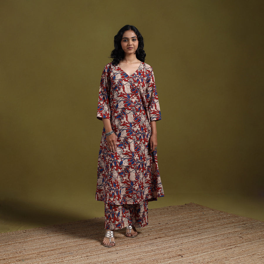 kalamkari printed 100% pure cotton 2pc kurta set. The A-line kurta with side pocket and palazzo with elasticated waist and pockets that allows easy movement. The screen printed patterns inspiration from traditional kalamkari art. Ideal for office wear, casual outings or everyday comfort.