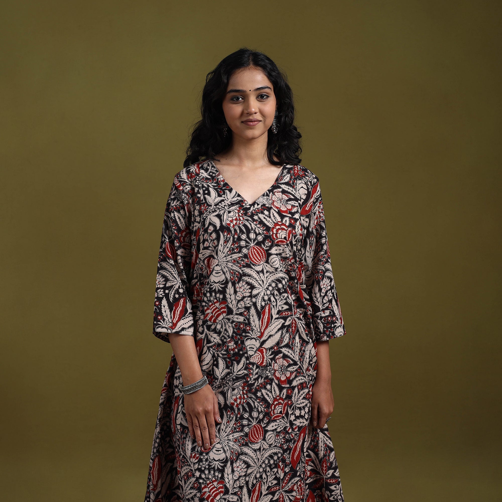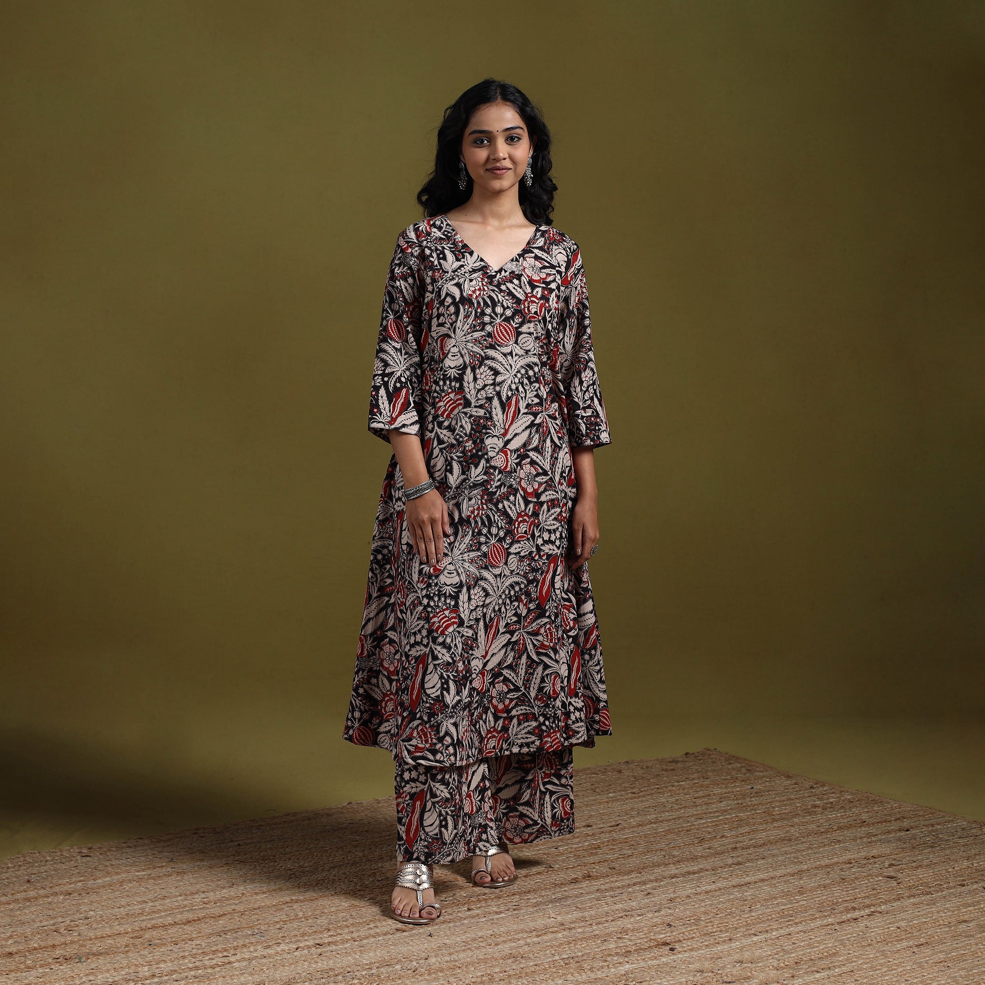 Black kalamkari printed 100% pure cotton 2pc kurta set. The A-line kurta with side pocket and palazzo with elasticated waist and pockets that allows easy movement. The screen printed patterns inspiration from traditional kalamkari art. Ideal for office wear, casual outings or everyday comfort.