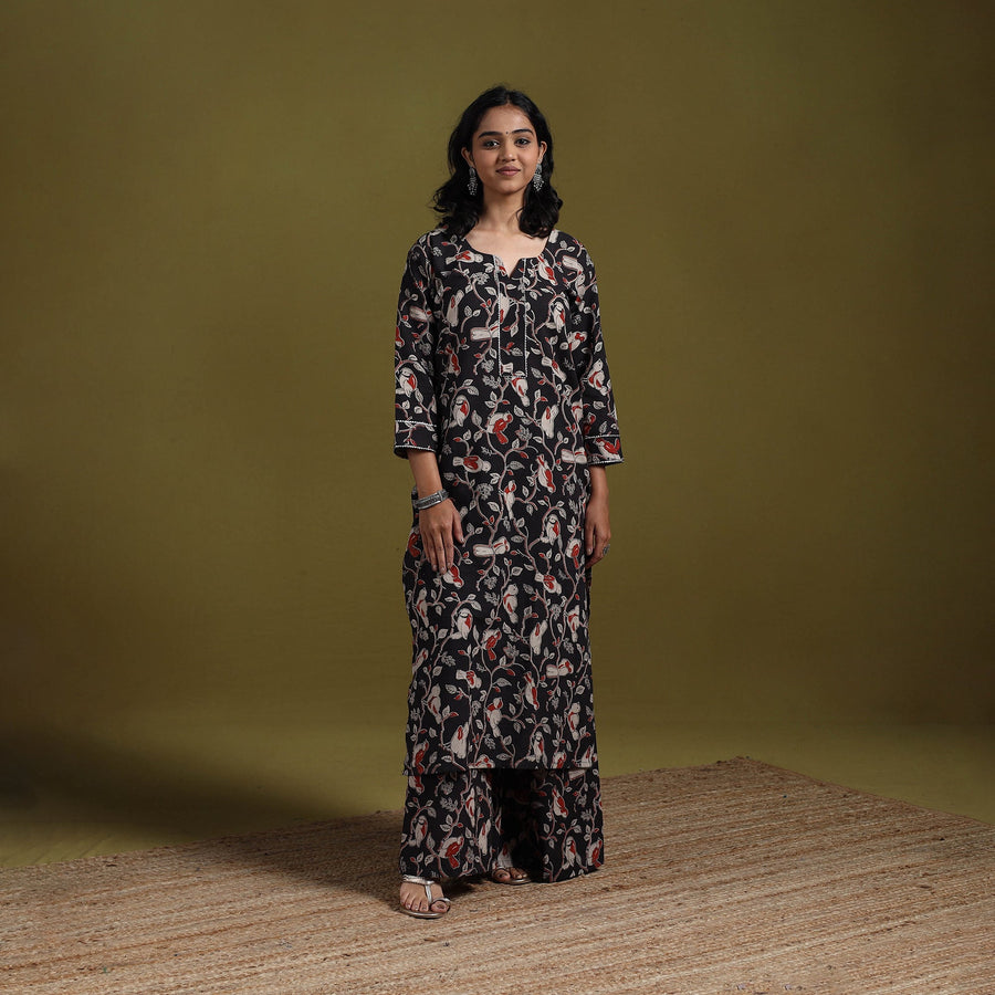 Black kalamkari printed 100% pure cotton 2pc kurta set. The straight gota work kurta with side pocket and flared palazzo with elasticated waist that allows easy movement. The screen printed patterns inspiration from traditional kalamkari art. Ideal for office wear, casual outings or everyday comfort.