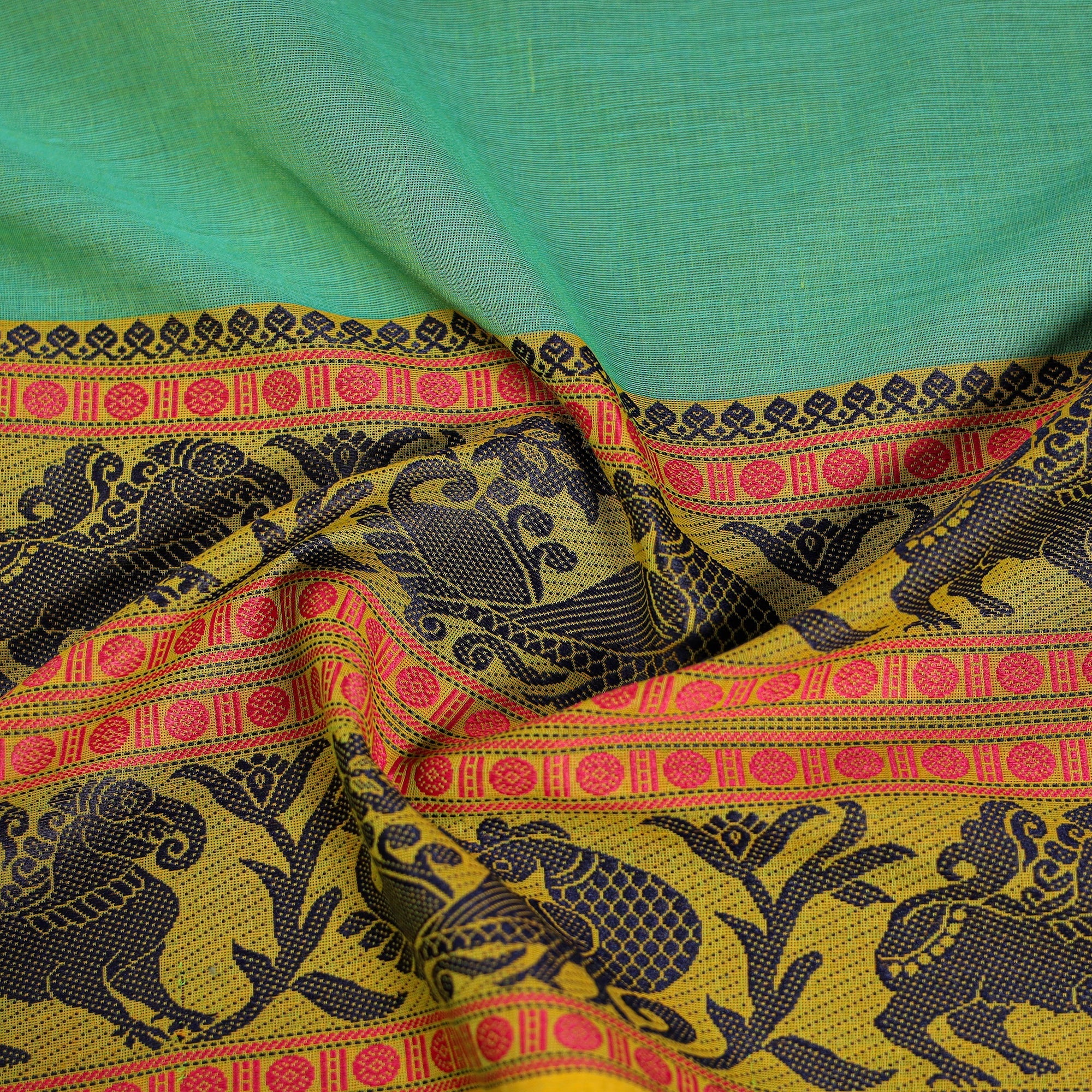Green kanchipuram cotton blouse piece, woven from soft and breathable fabric, offers a perfect blend of comfort and ease. Known for its durability, it pairs effortlessly with sarees for both everyday wear and special occasions. Easy to tailor in your preferred style, it’s a dependable choice for creating elegant and versatile blouse designs.