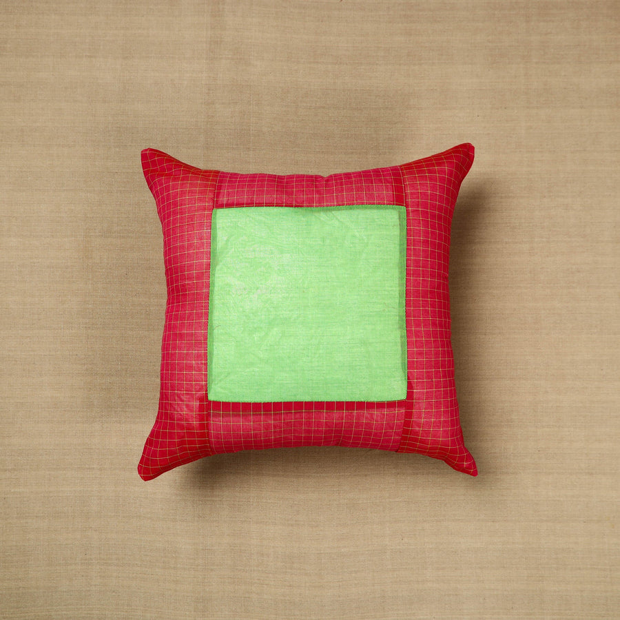 Kanchipuram patchwork red cushion cover in cotton. Designed with intricate patterns using age old techniques its lightweight, durable and ideal for daily use. Perfect for enhancing sofas, chairs, or beds, this cushion cover brings cultural elegance to your living space.