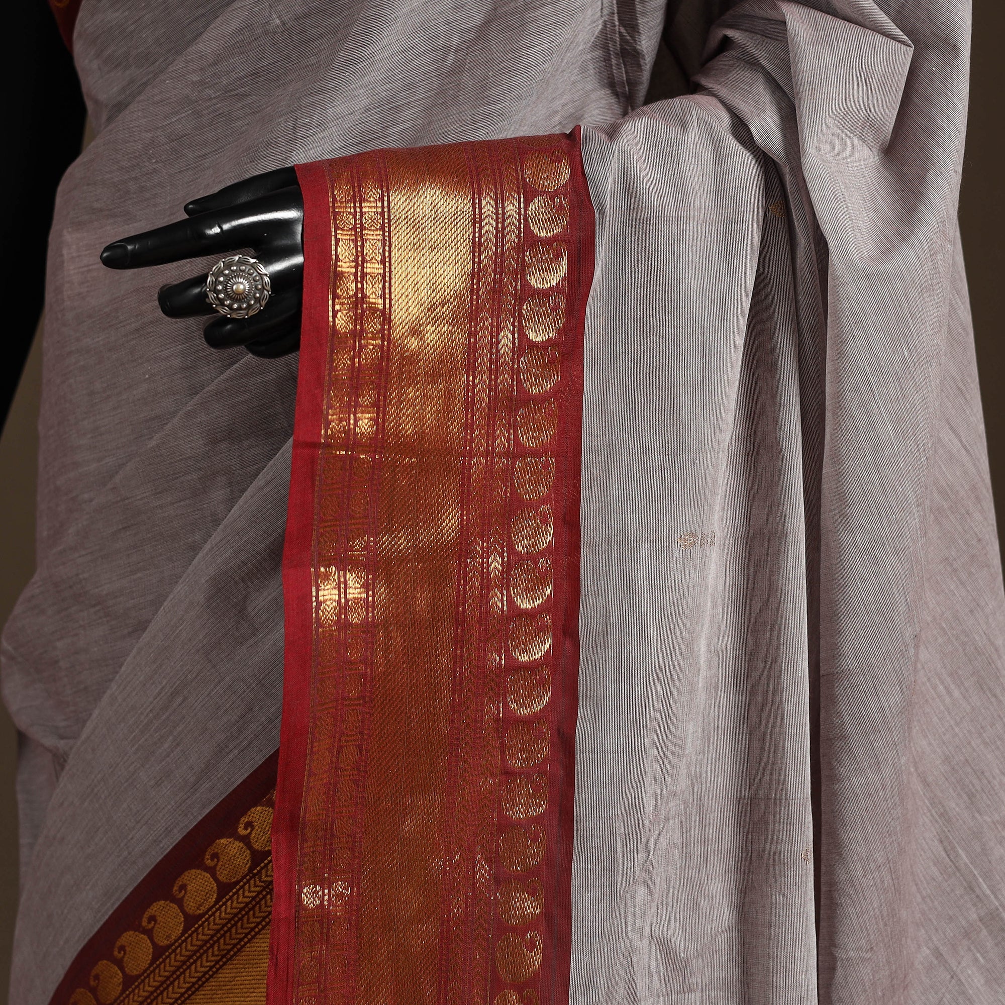 This pink chettinad saree, also known as kandangi, reflects the traditional weaving heritage of Tamil Nadu. Woven from soft, breathable cotton, it features intricate thread buti motifs across the body. The contrasting border adds to its timeless appeal, making it ideal for everyday wear, office attire, or festive occasions.