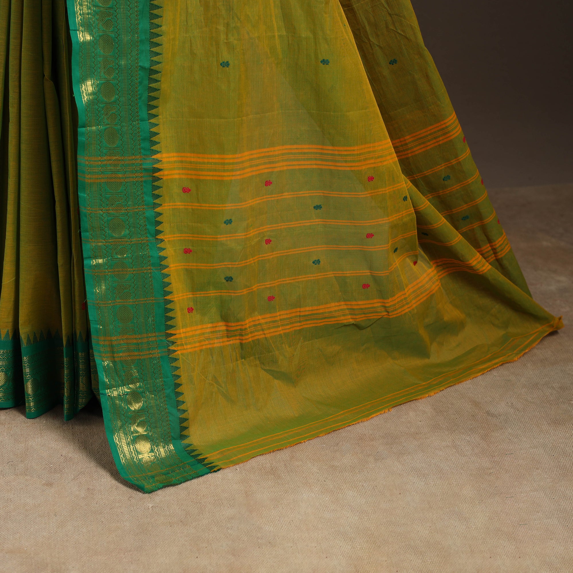 This green chettinad saree, also known as kandangi, reflects the traditional weaving heritage of Tamil Nadu. Woven from soft, breathable cotton, it features intricate thread buti motifs across the body. The contrasting border adds to its timeless appeal, making it ideal for everyday wear, office attire, or festive occasions.
