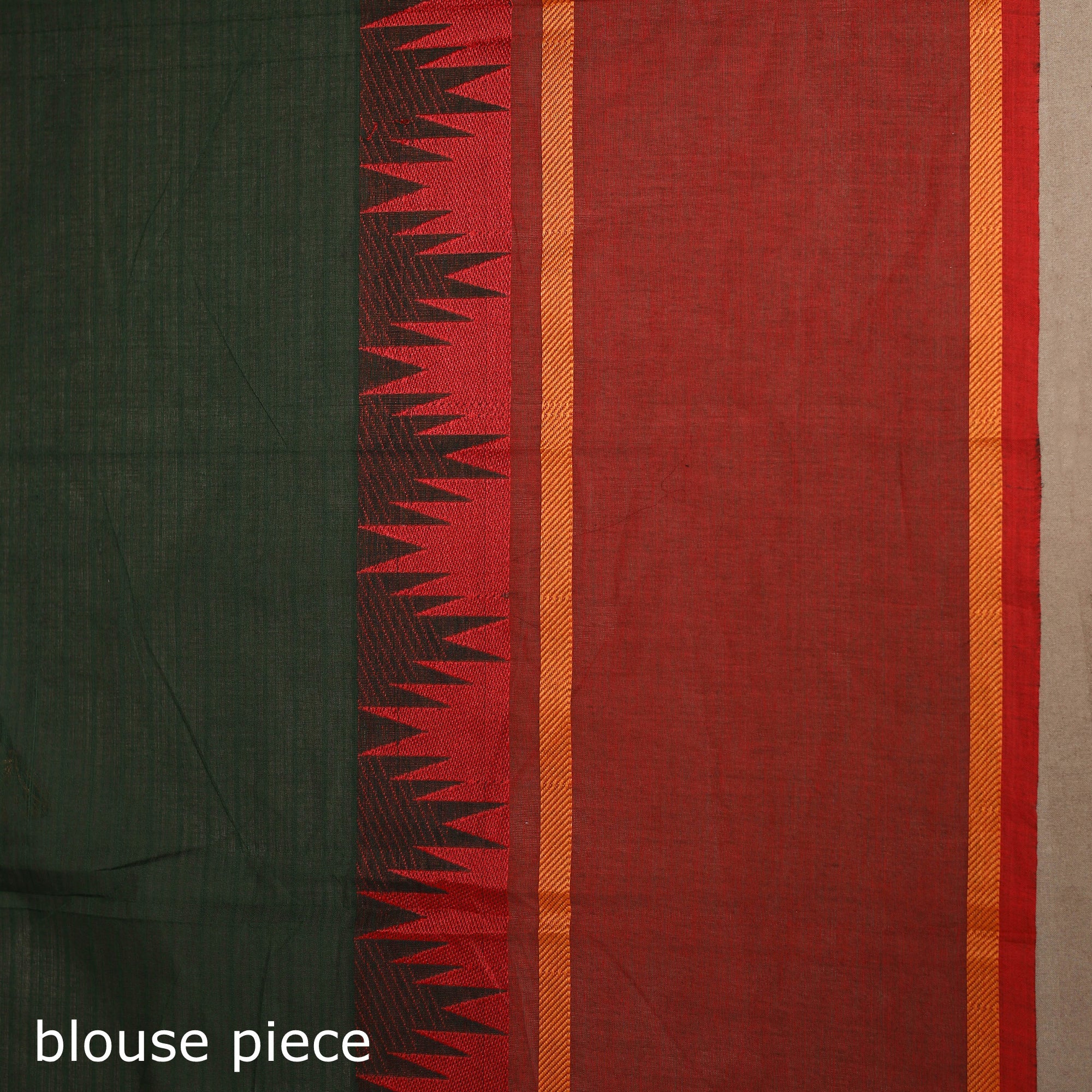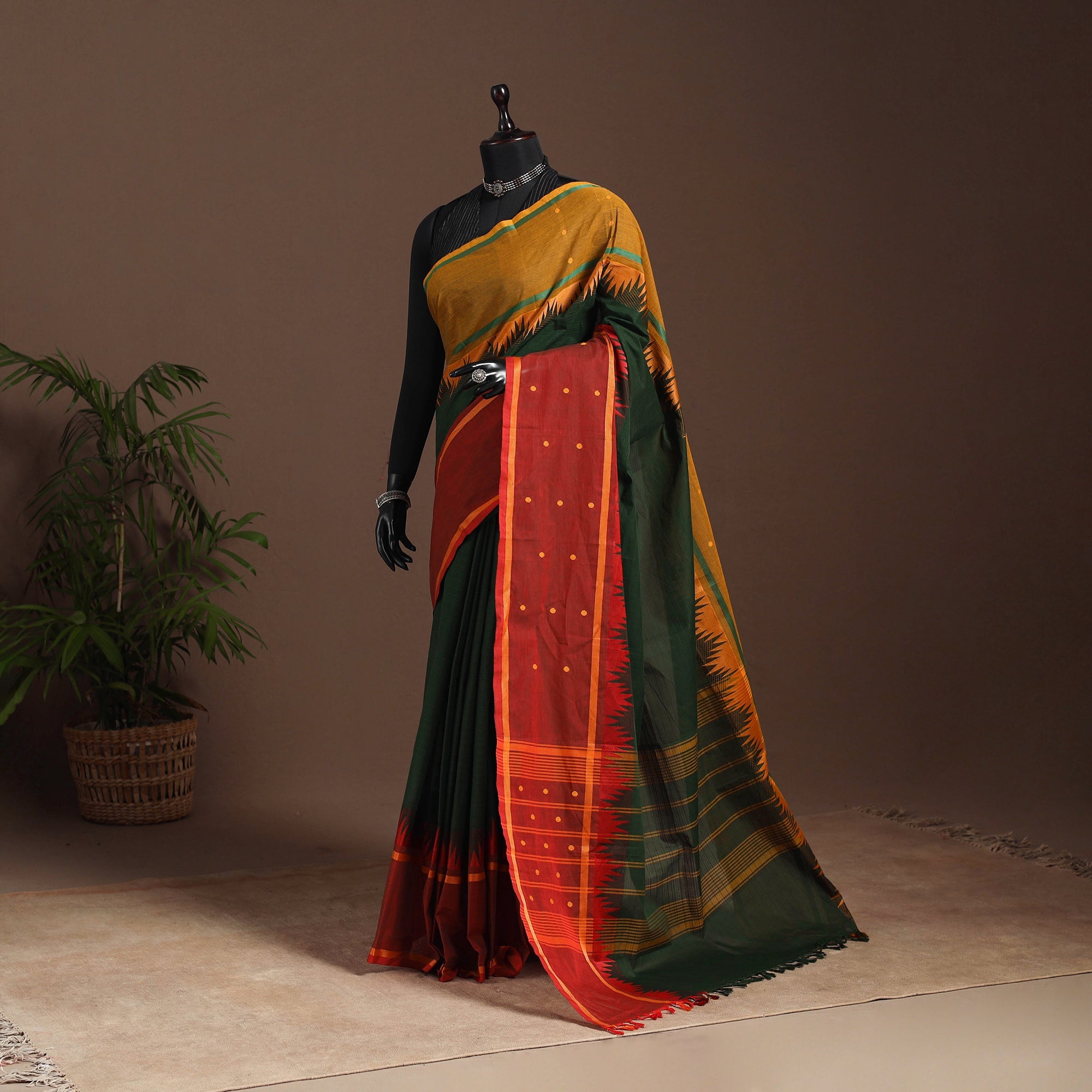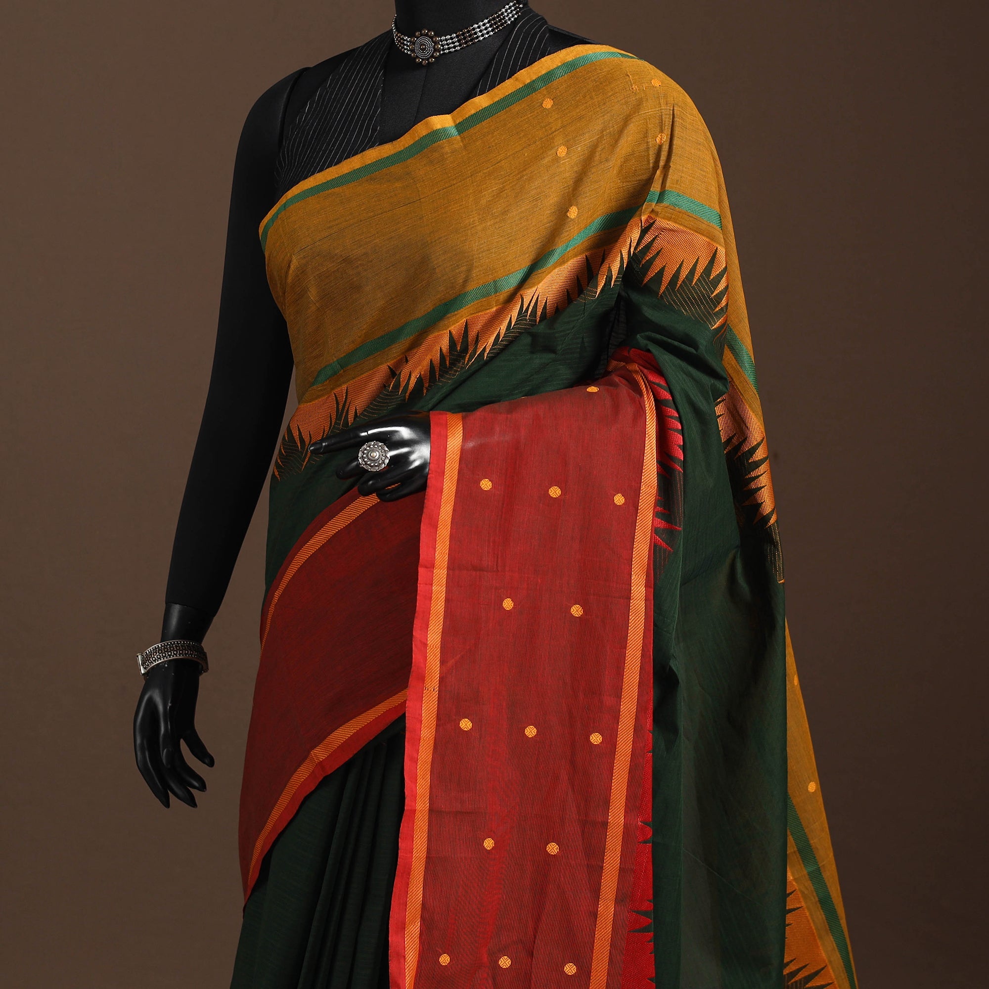 This green chettinad saree, also known as kandangi, reflects the traditional weaving heritage of Tamil Nadu. Woven from soft, breathable cotton, it features intricate thread buti motifs across the body. The contrasting border adds to its timeless appeal, making it ideal for everyday wear, office attire, or festive occasions.
