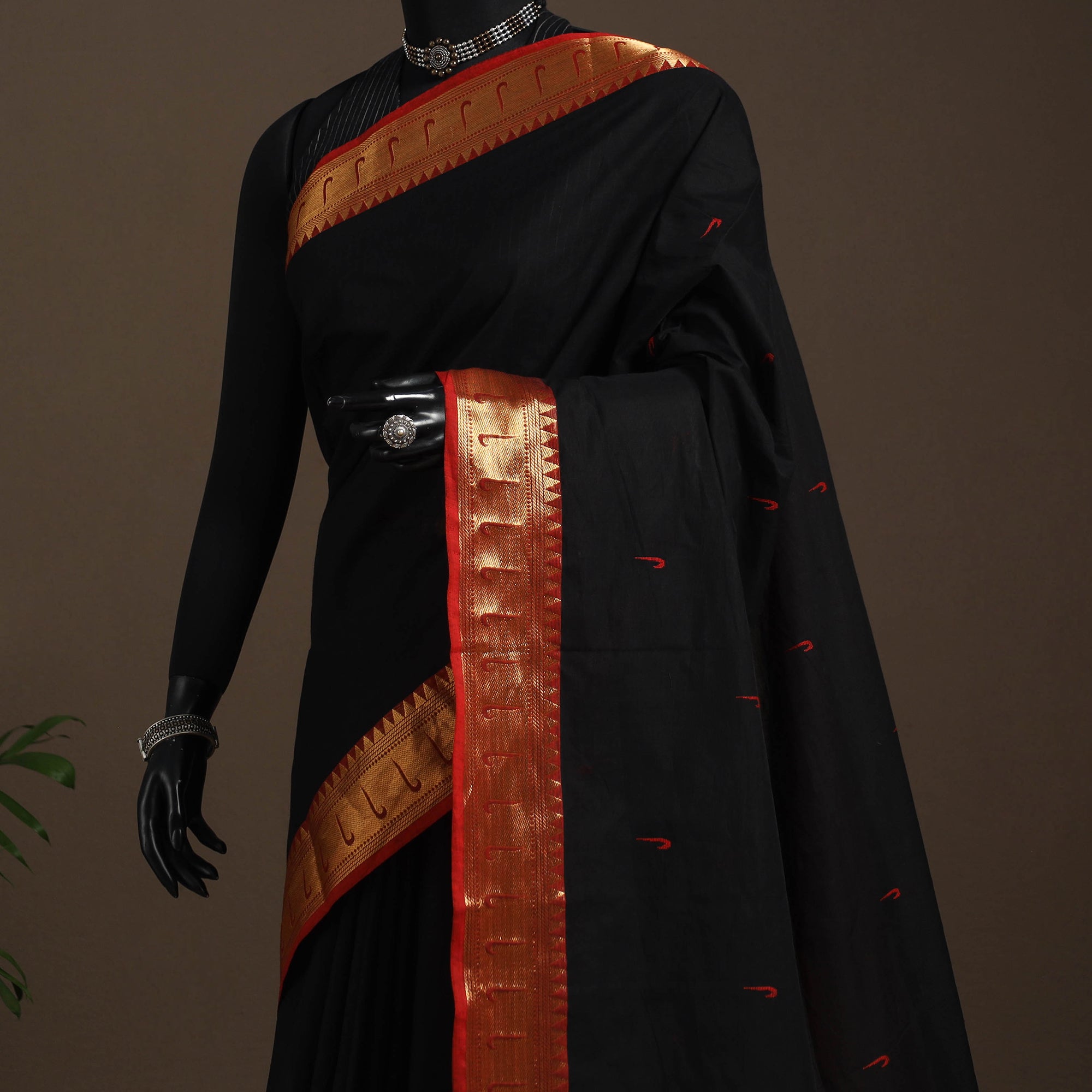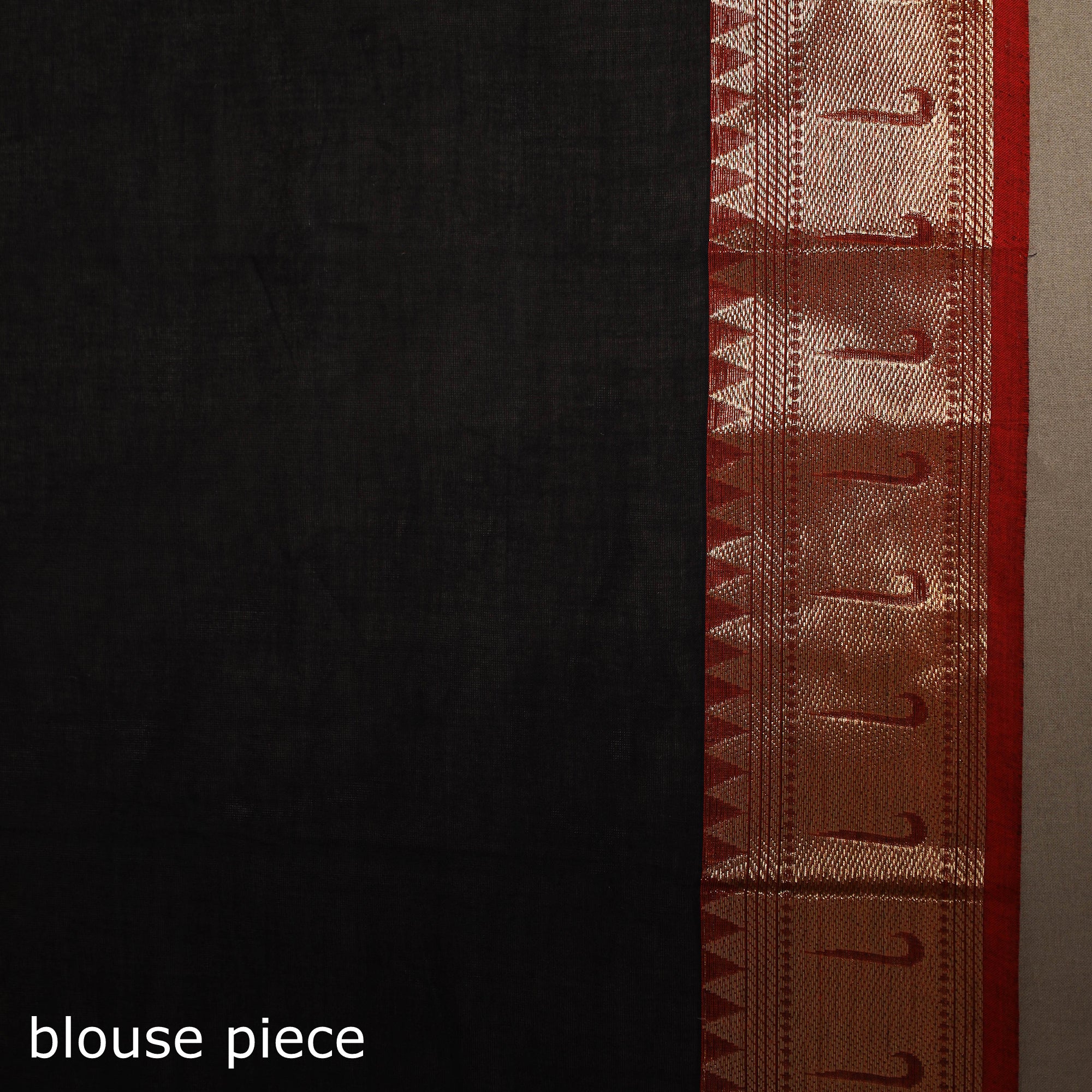 This black chettinad saree, also known as kandangi, reflects the traditional weaving heritage of Tamil Nadu. Woven from soft, breathable cotton, it features intricate thread buti motifs across the body. The contrasting border adds to its timeless appeal, making it ideal for everyday wear, office attire, or festive occasions.
