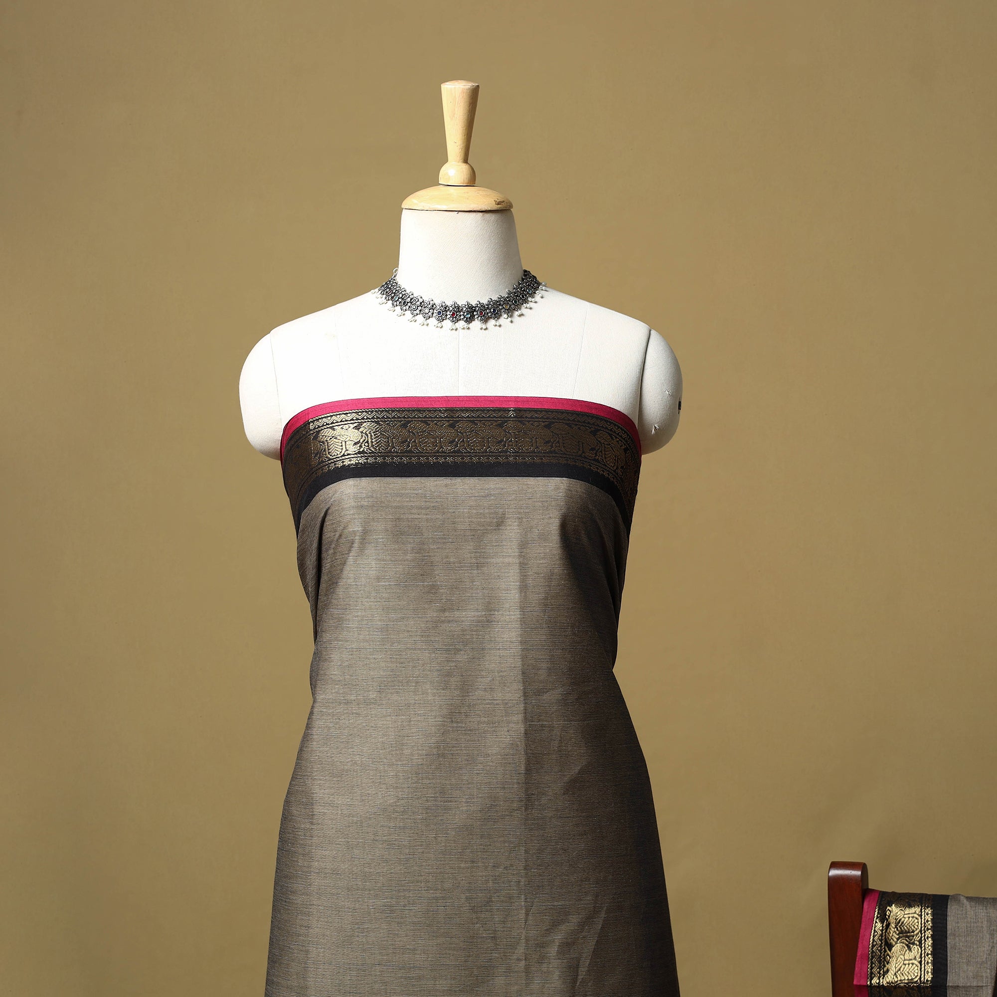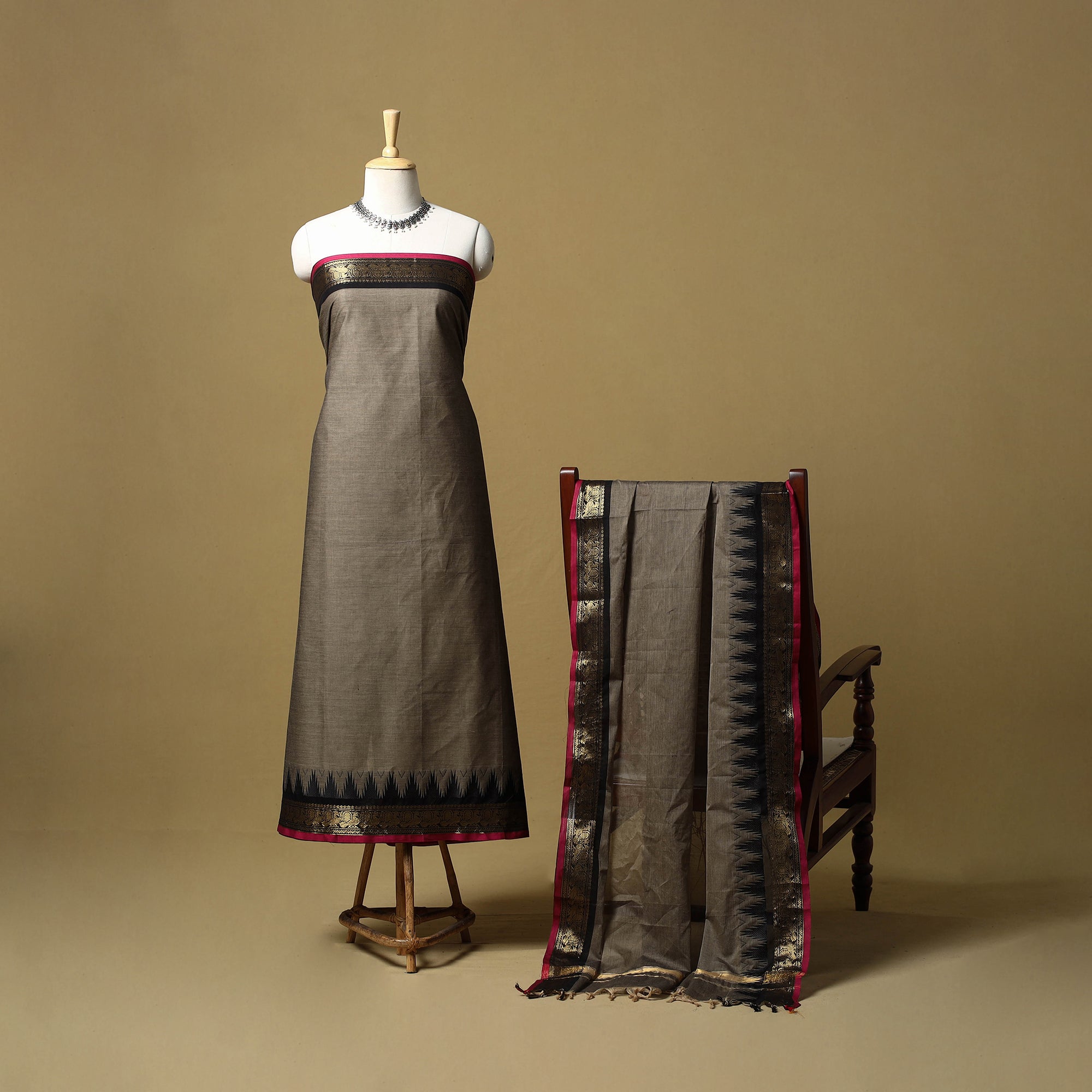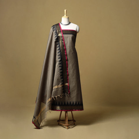 Brown 2pc kandangi chettinad 2pc unstitched dress material from Tamil Nadu is known for its traditional weaving techniques, contrasting border. The set includes a kurta fabric with a woven border, paired with a matching dupatta. Made from cotton, the set feels breathable and is suitable for daily wear, office use or even festive dressing.
