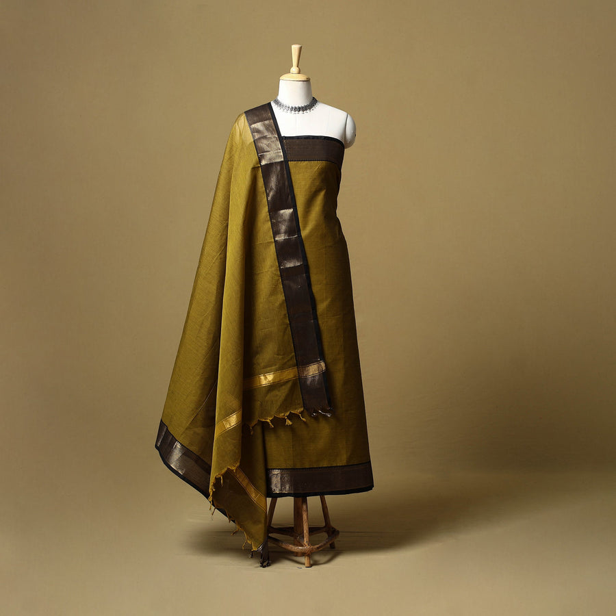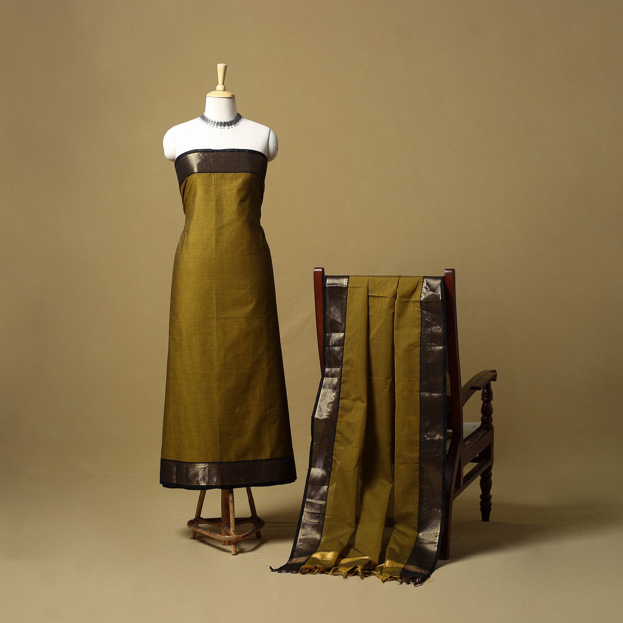 2pc kandangi chettinad 2pc unstitched dress material from Tamil Nadu is known for its traditional weaving techniques, contrasting border. The set includes a kurta fabric with a woven border, paired with a matching dupatta. Made from cotton, the set feels breathable and is suitable for daily wear, office use or even festive dressing.