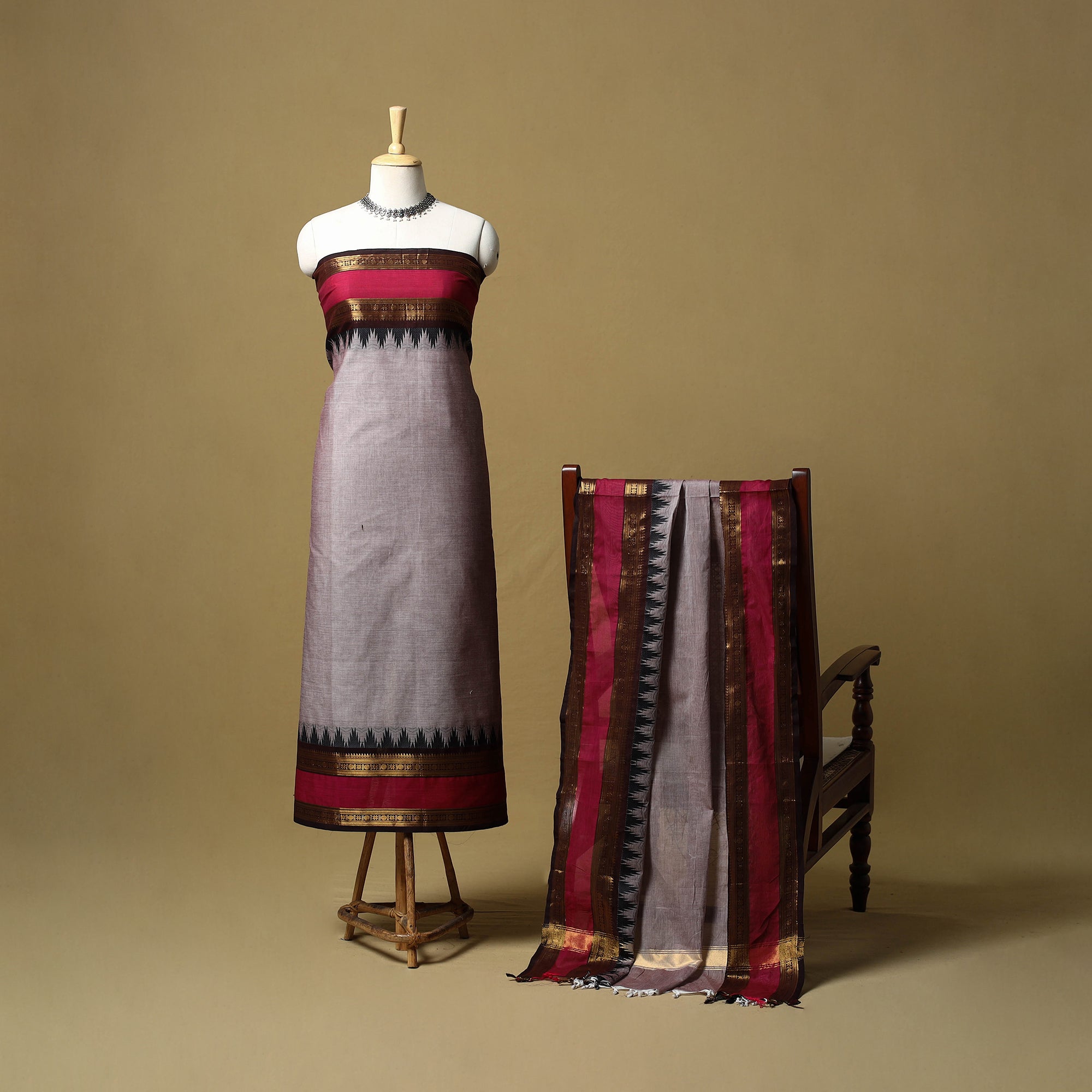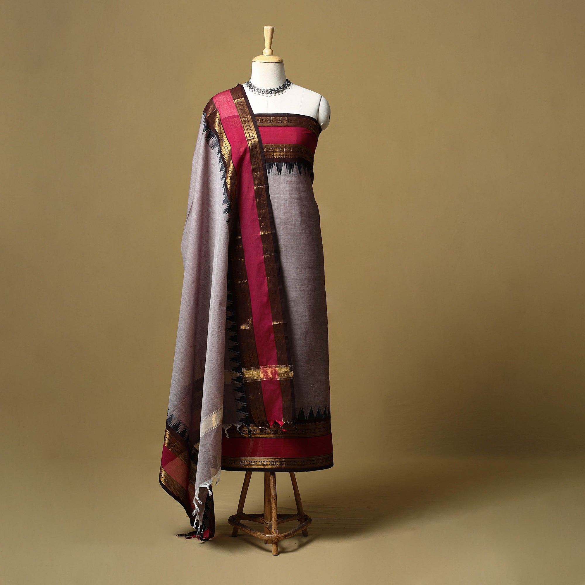 2pc kandangi chettinad 2pc unstitched dress material from Tamil Nadu is known for its traditional weaving techniques, contrasting border. The set includes a kurta fabric with a woven border, paired with a matching dupatta. Made from cotton, the set feels breathable and is suitable for daily wear, office use or even festive dressing.