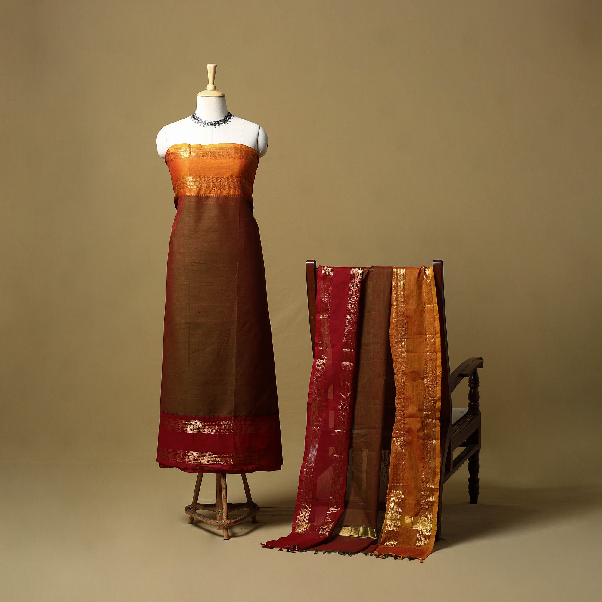 2pc kandangi chettinad 2pc unstitched dress material from Tamil Nadu is known for its traditional weaving techniques, contrasting border. The set includes a kurta fabric with a woven border, paired with a matching dupatta. Made from cotton, the set feels breathable and is suitable for daily wear, office use or even festive dressing.