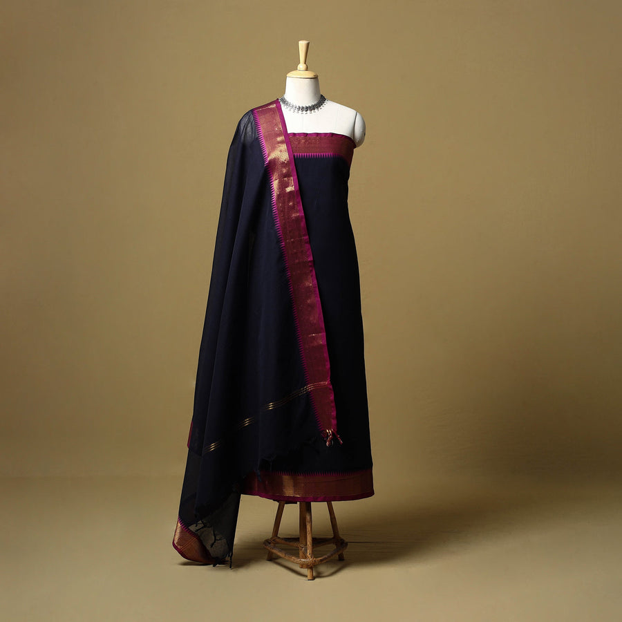 2pc kandangi chettinad 2pc unstitched dress material from Tamil Nadu is known for its traditional weaving techniques, contrasting border. The set includes a kurta fabric with a woven border, paired with a matching dupatta. Made from cotton, the set feels breathable and is suitable for daily wear, office use or even festive dressing.