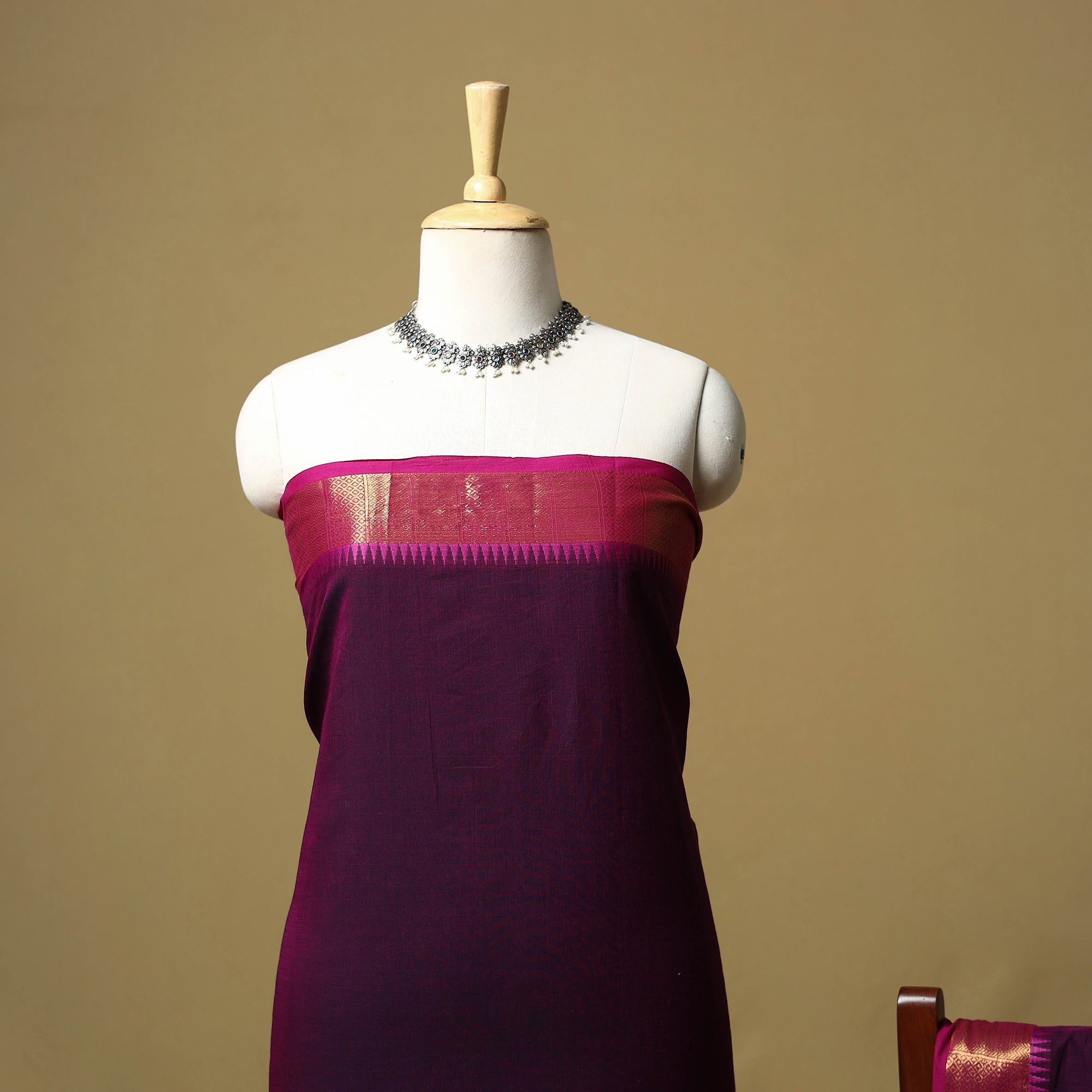 2pc kandangi chettinad 2pc unstitched dress material from Tamil Nadu is known for its traditional weaving techniques, contrasting border. The set includes a kurta fabric with a woven border, paired with a matching dupatta. Made from cotton, the set feels breathable and is suitable for daily wear, office use or even festive dressing.