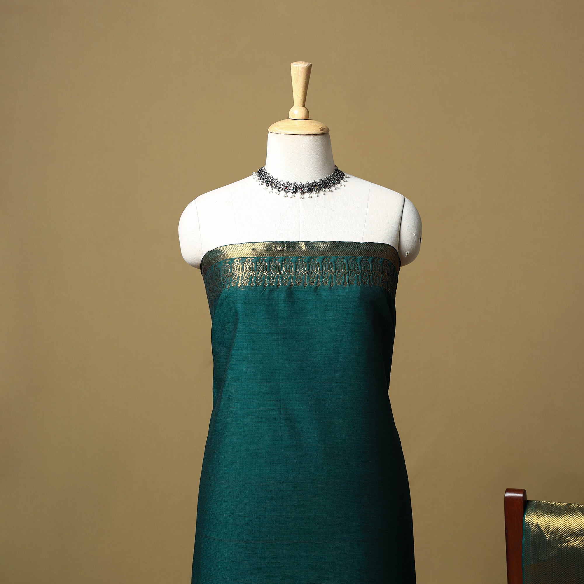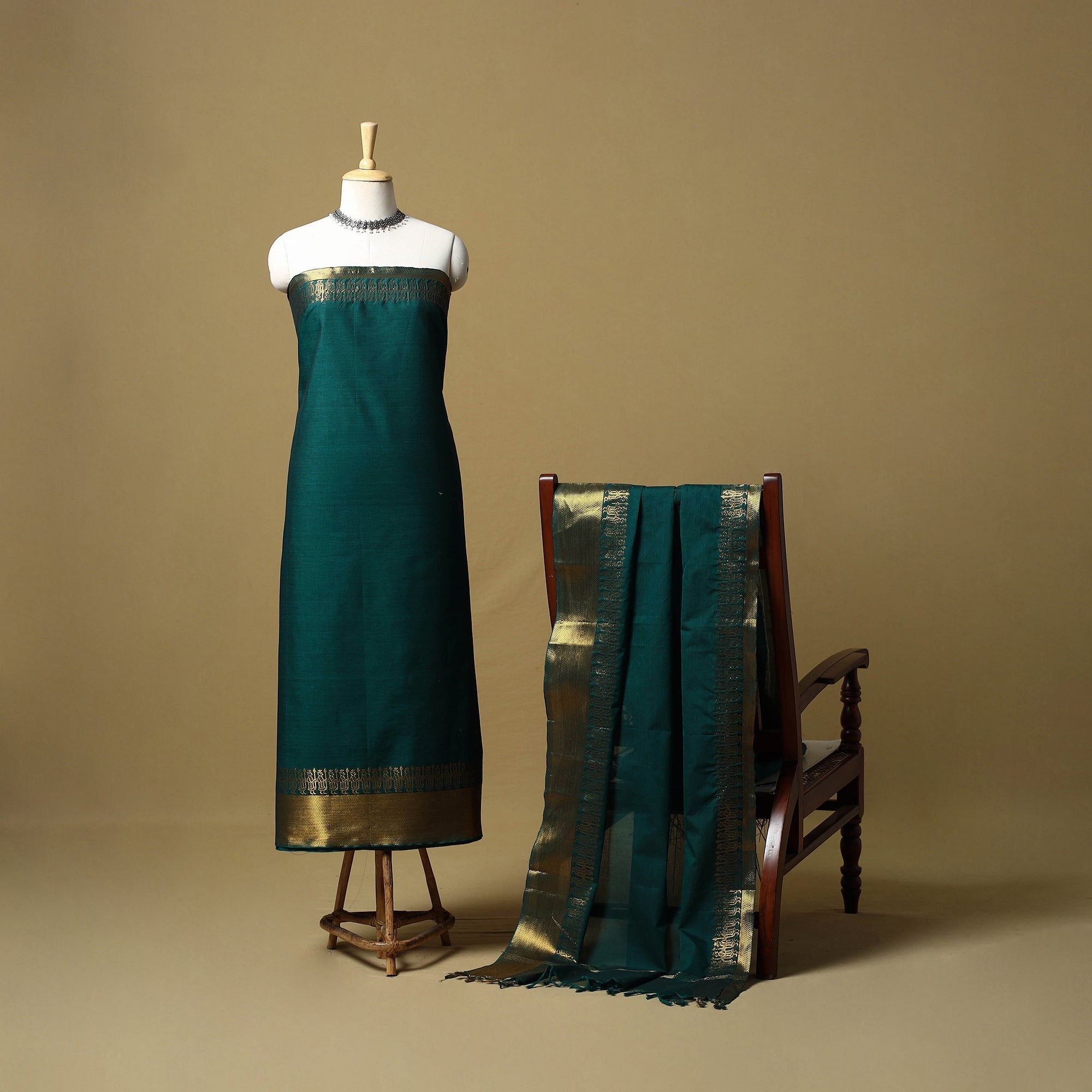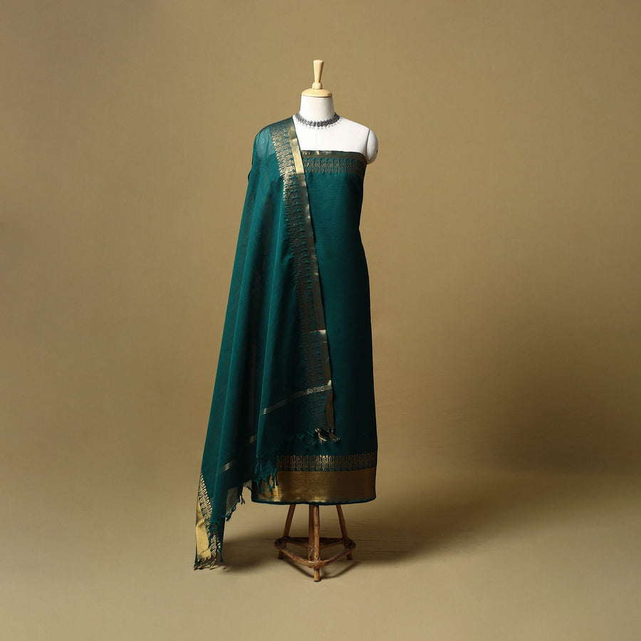 2pc kandangi chettinad 2pc unstitched dress material from Tamil Nadu is known for its traditional weaving techniques, contrasting border. The set includes a kurta fabric with a woven border, paired with a matching dupatta. Made from cotton, the set feels breathable and is suitable for daily wear, office use or even festive dressing.