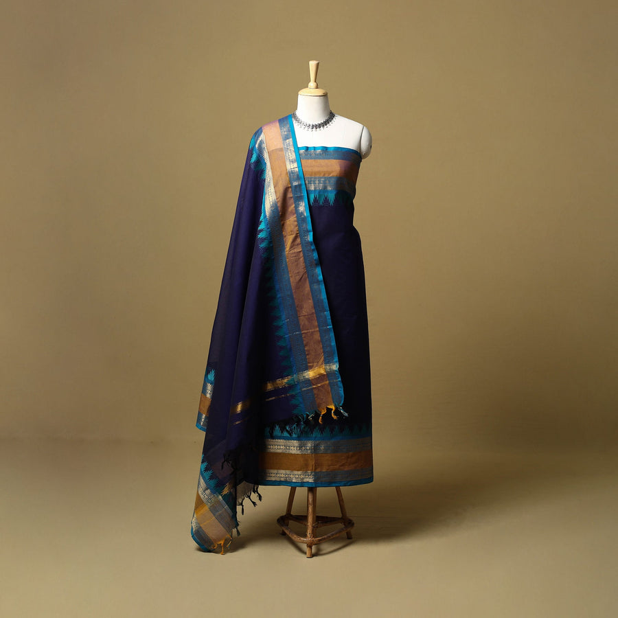 2pc kandangi chettinad 2pc unstitched dress material from Tamil Nadu is known for its traditional weaving techniques, contrasting border. The set includes a kurta fabric with a woven border, paired with a matching dupatta. Made from cotton, the set feels breathable and is suitable for daily wear, office use or even festive dressing.
