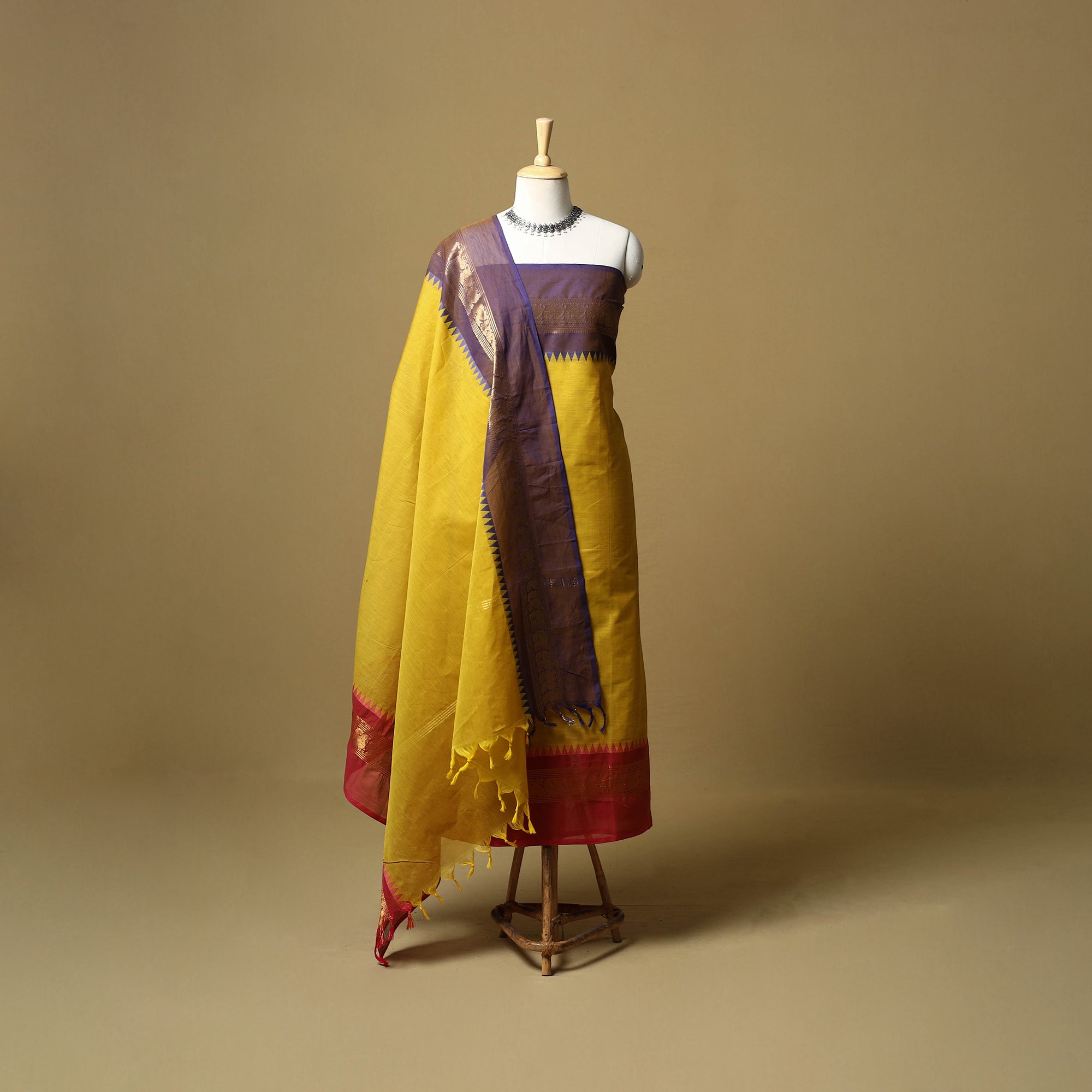 2pc kandangi chettinad 2pc unstitched dress material from Tamil Nadu is known for its traditional weaving techniques, contrasting border. The set includes a kurta fabric with a woven border, paired with a matching dupatta. Made from cotton, the set feels breathable and is suitable for daily wear, office use or even festive dressing.