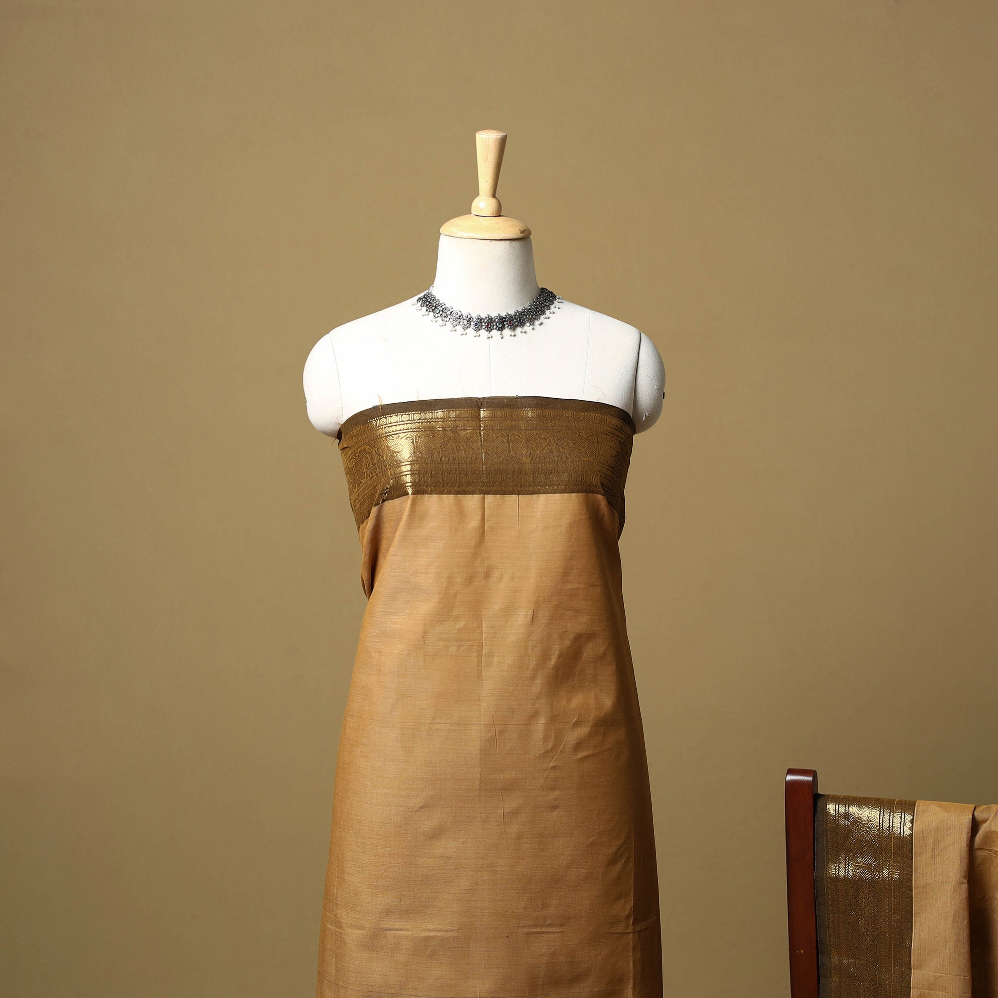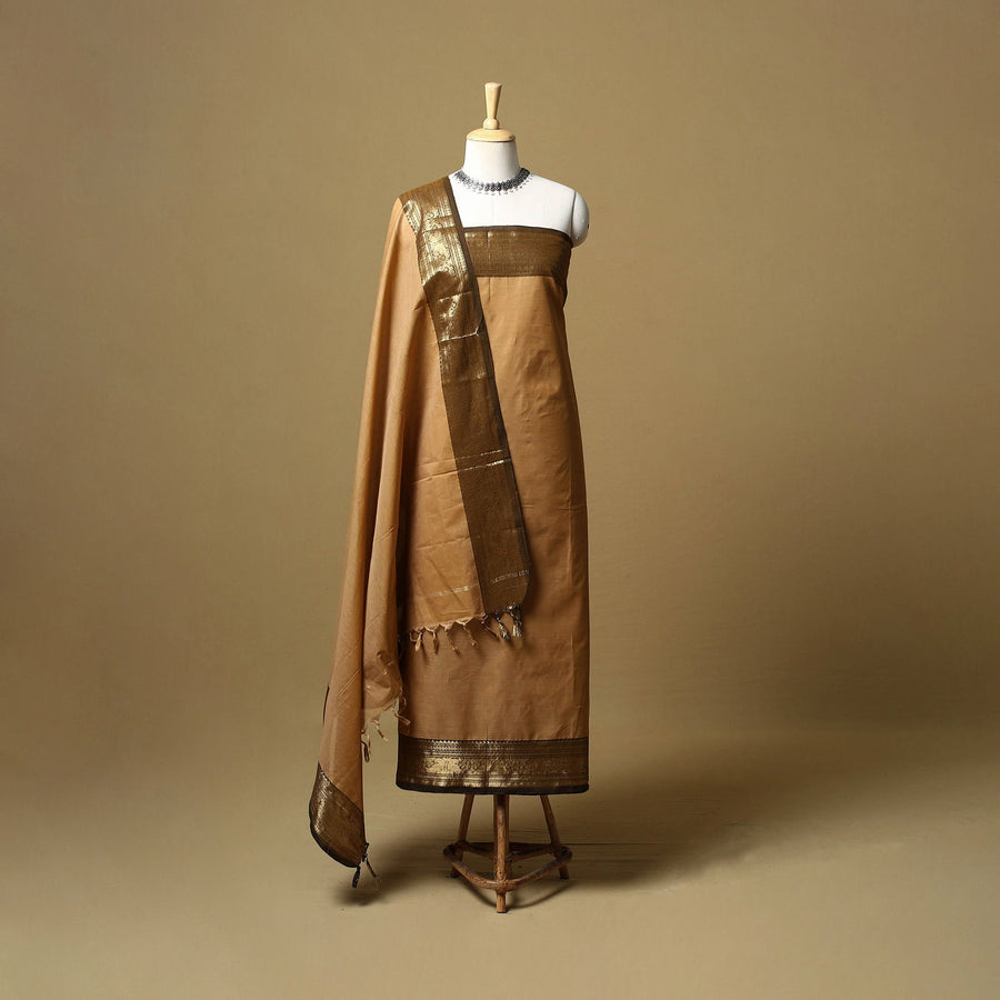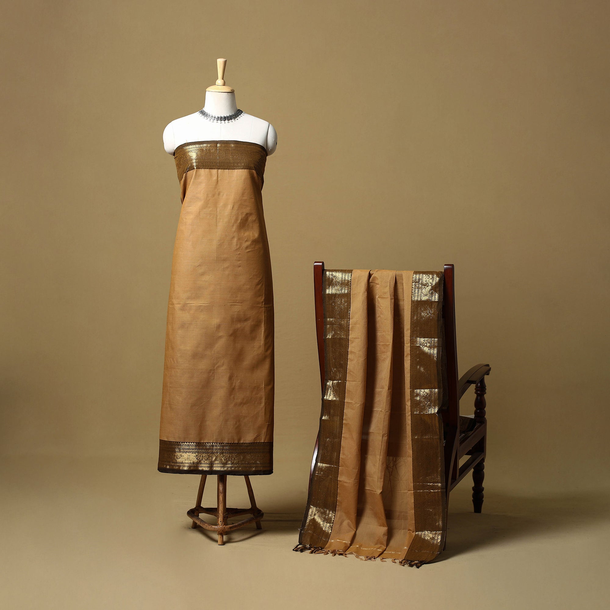 Beige 2pc kandangi chettinad 2pc unstitched dress material from Tamil Nadu is known for its traditional weaving techniques, contrasting border. The set includes a kurta fabric with a woven border, paired with a matching dupatta. Made from cotton, the set feels breathable and is suitable for daily wear, office use or even festive dressing.