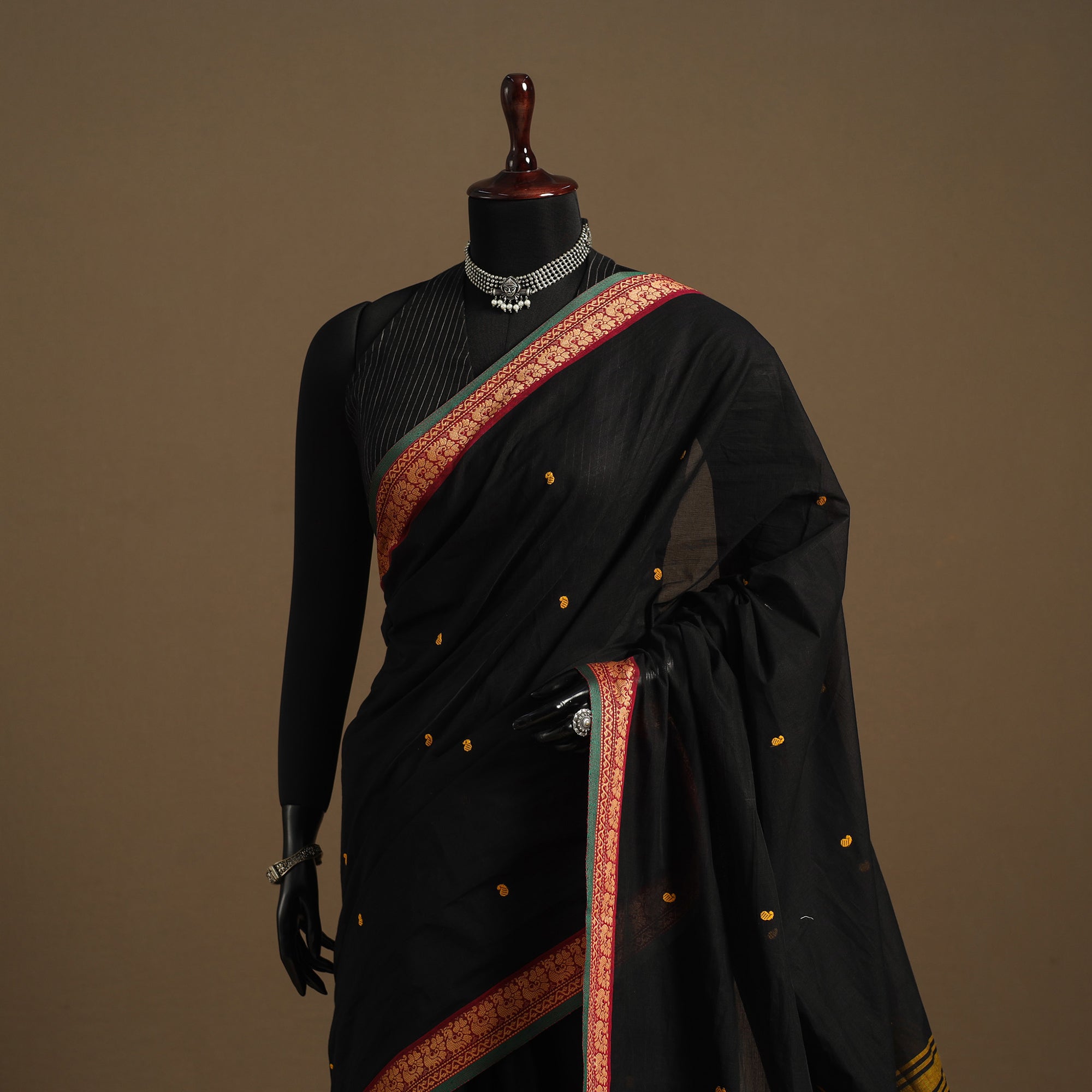 This black chettinad cotton saree reflects the rich textile legacy of Tamil Nadu. Locally known as Kandangi, it showcases traditional weaving and a subtle border that adds elegance. Crafted from breathable cotton, it’s perfect for casual wear, office looks, or festive moments.