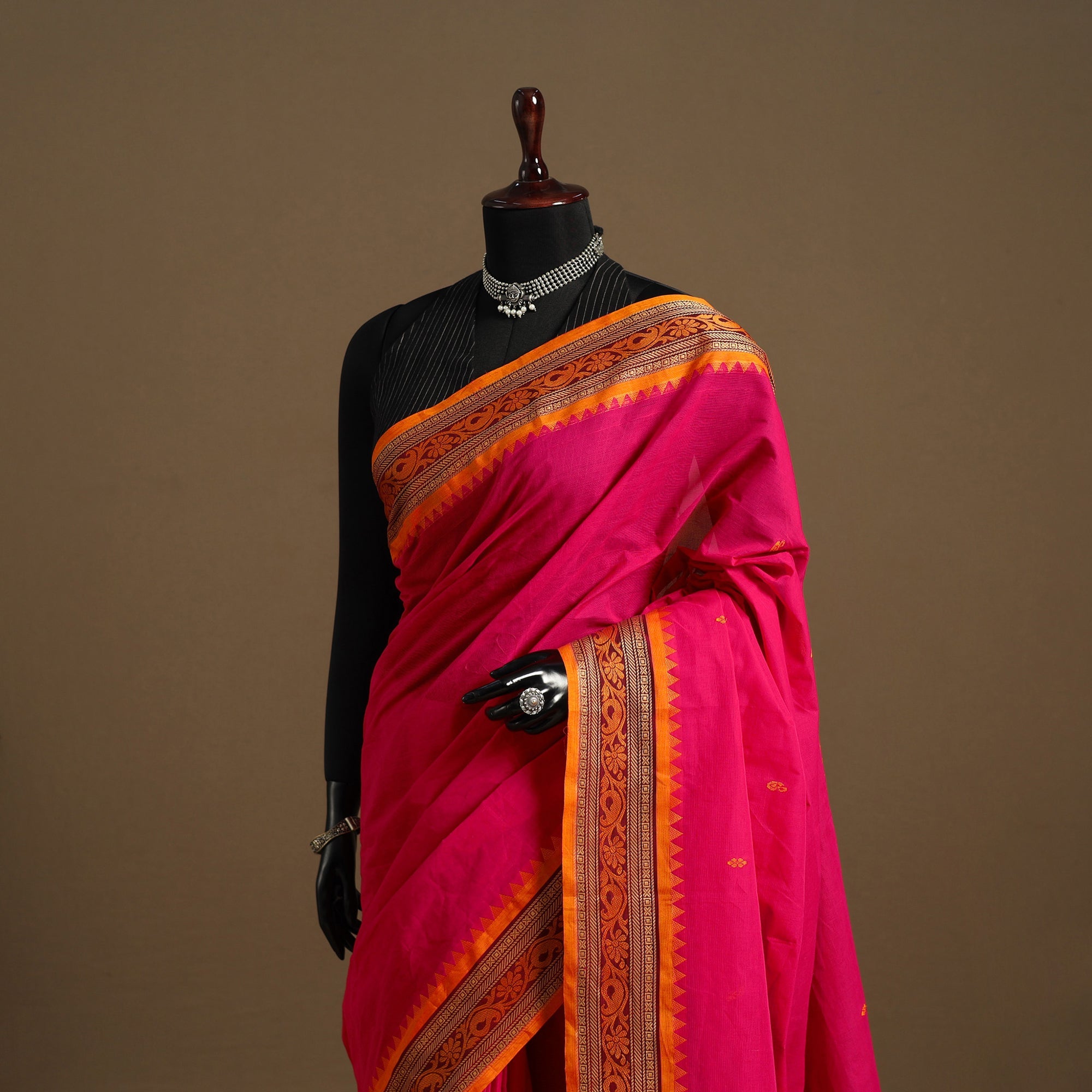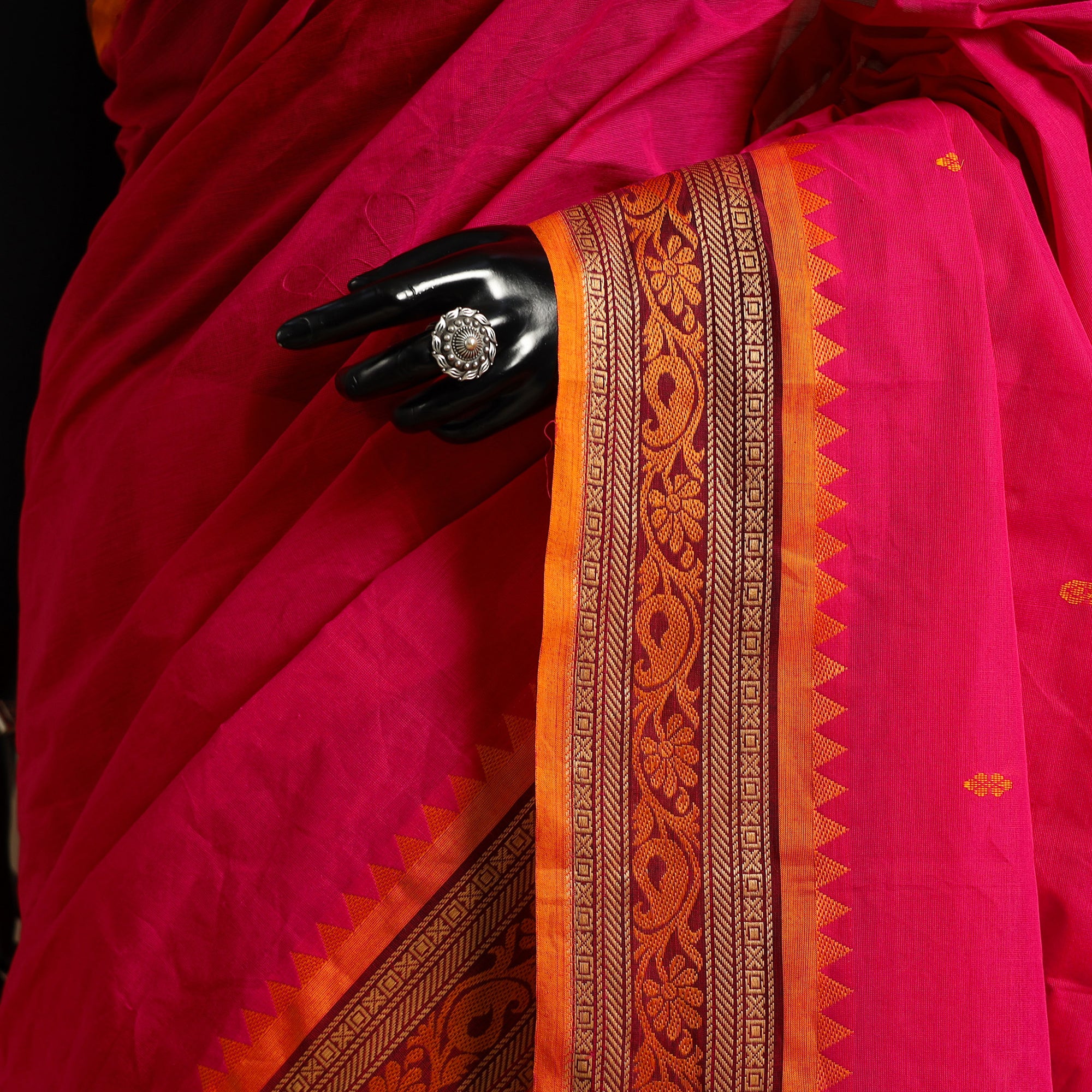 This pink chettinad cotton saree reflects the rich textile legacy of Tamil Nadu. Locally known as Kandangi, it showcases traditional weaving and a subtle border that adds elegance. Crafted from breathable cotton, it’s perfect for casual wear, office looks, or festive moments.