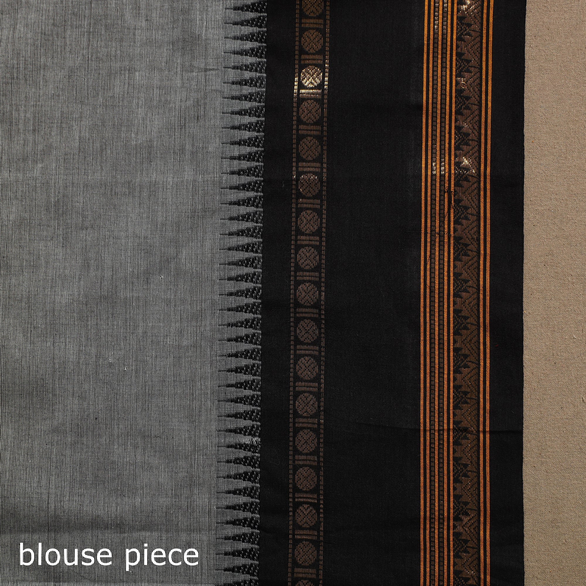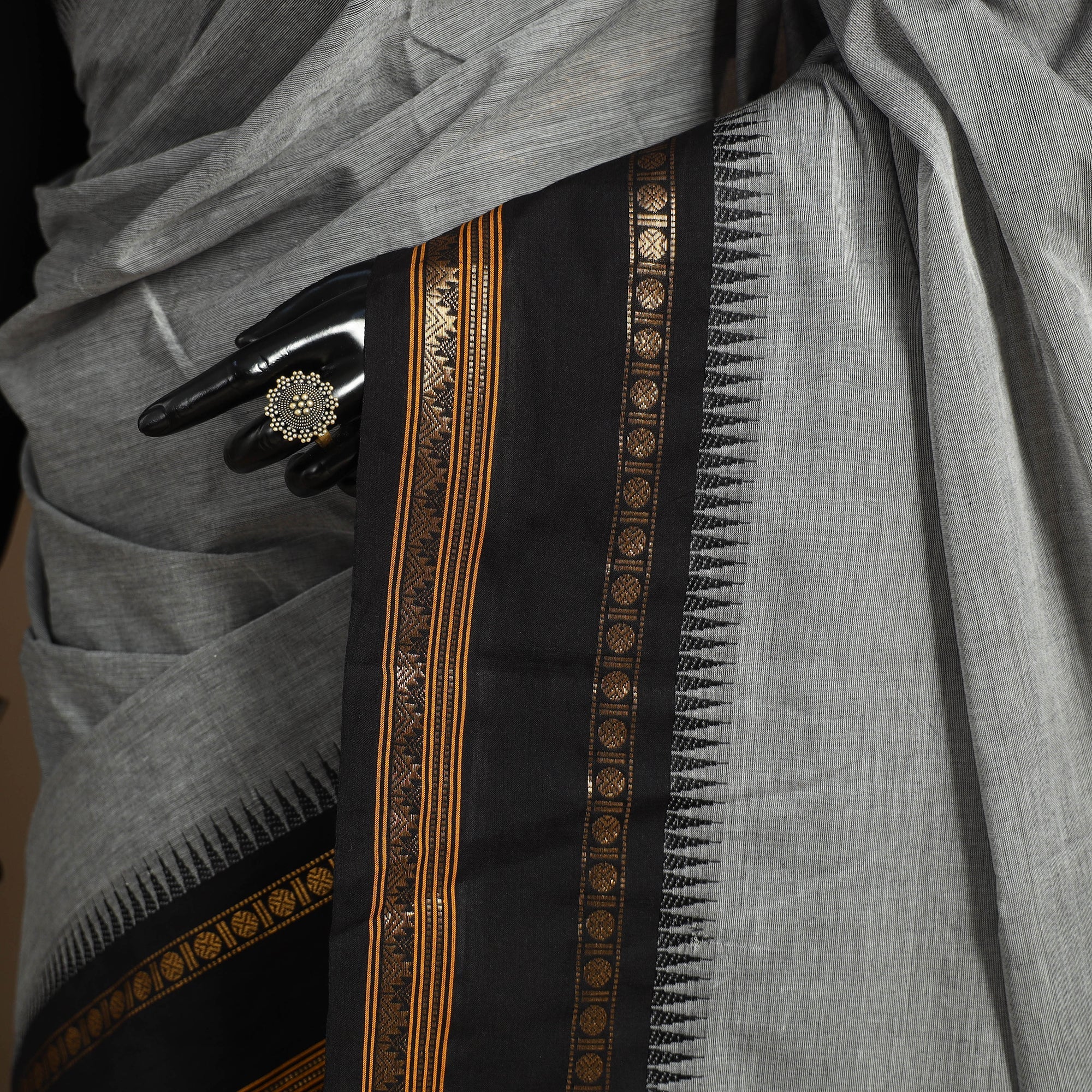 This traditional grey Chettinad saree reflects the rich textile heritage of Tamil Nadu. Also known as Kandangi, it features classic weaving patterns and a subtle border that enhances its grace. Woven in breathable cotton, it’s ideal for daily wear, office dressing, or festive occasions.