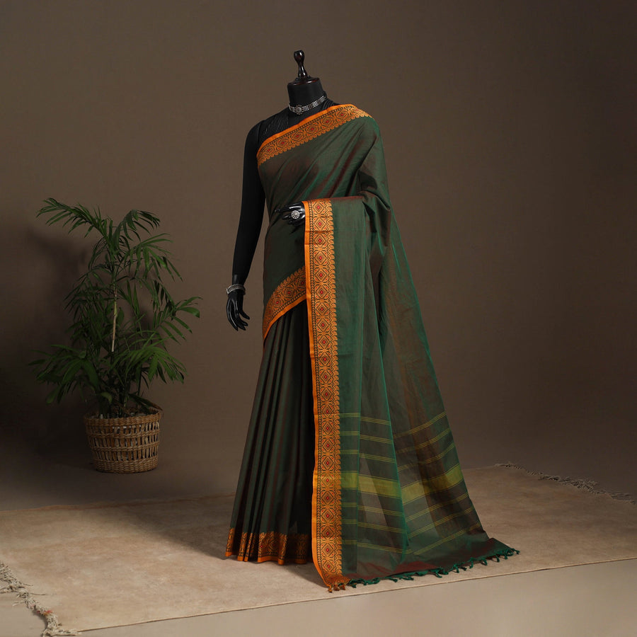 This green chettinad saree, also known as Kandangi, beautifully represents Tamil Nadu’s traditional weaving style. Made from soft, breathable cotton, it features elegant patterns and a graceful border that adds timeless charm. Perfect for everyday wear, office attire, or festive celebrations.