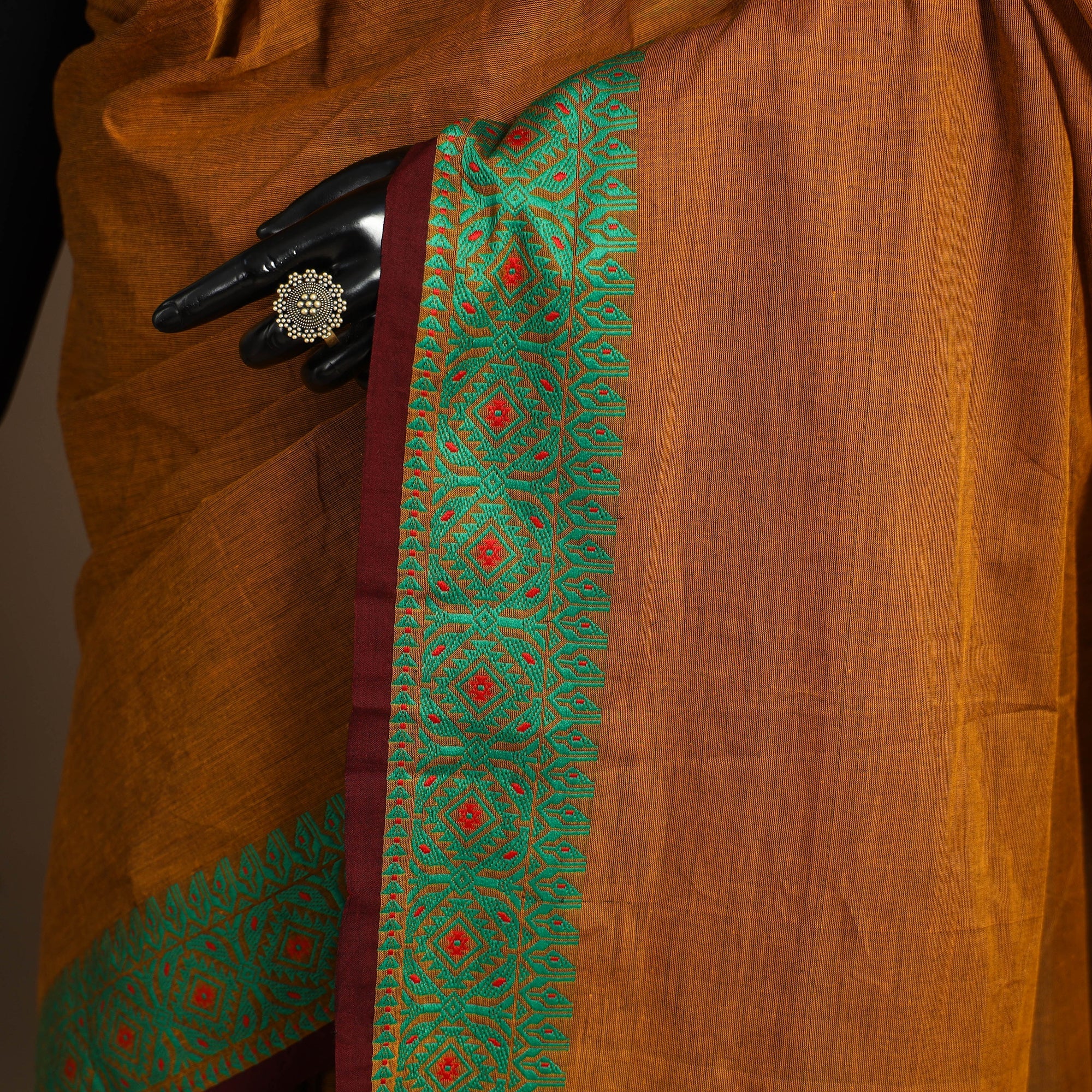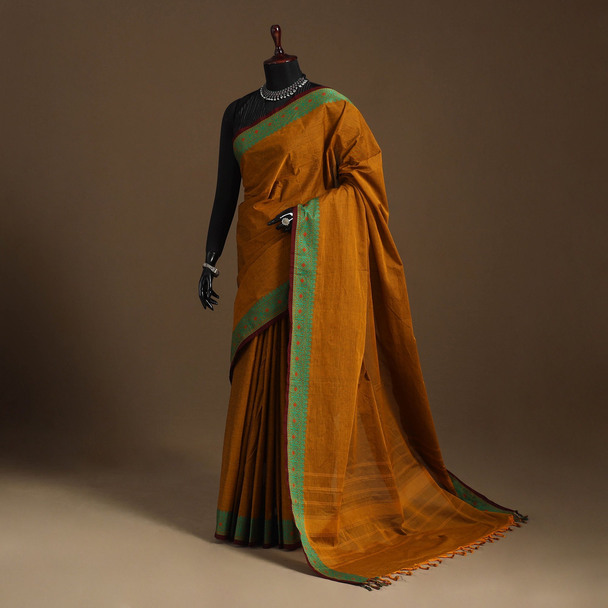 This traditional brown Chettinad saree reflects the rich textile heritage of Tamil Nadu. Also known as Kandangi, it features classic weaving patterns and a subtle border that enhances its grace. Woven in breathable cotton, it’s ideal for daily wear, office dressing, or festive occasions.