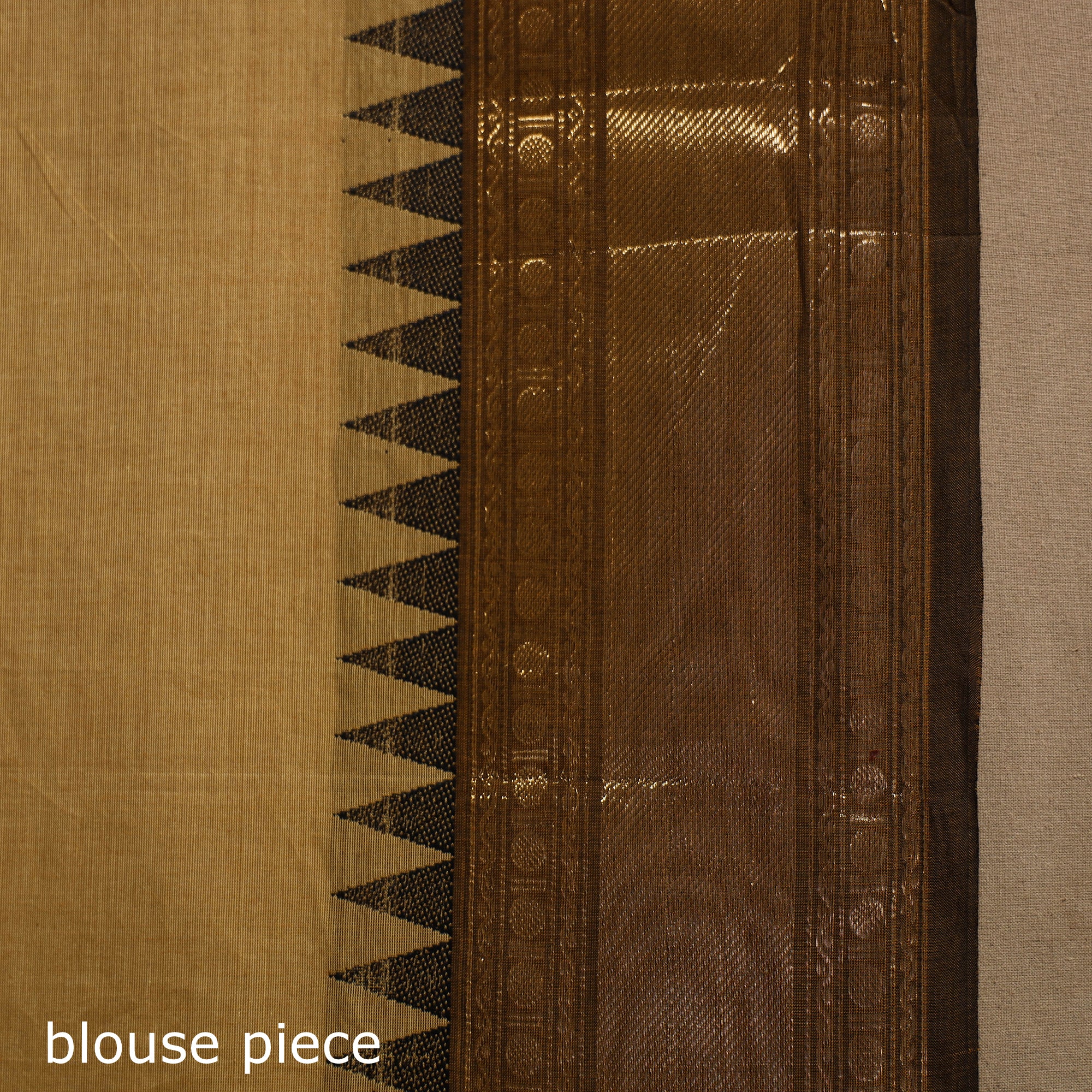 This traditional beige Chettinad saree reflects the rich textile heritage of Tamil Nadu. Also known as Kandangi, it features classic weaving patterns and a subtle border that enhances its grace. Woven in breathable cotton, it’s ideal for daily wear, office dressing, or festive occasions.