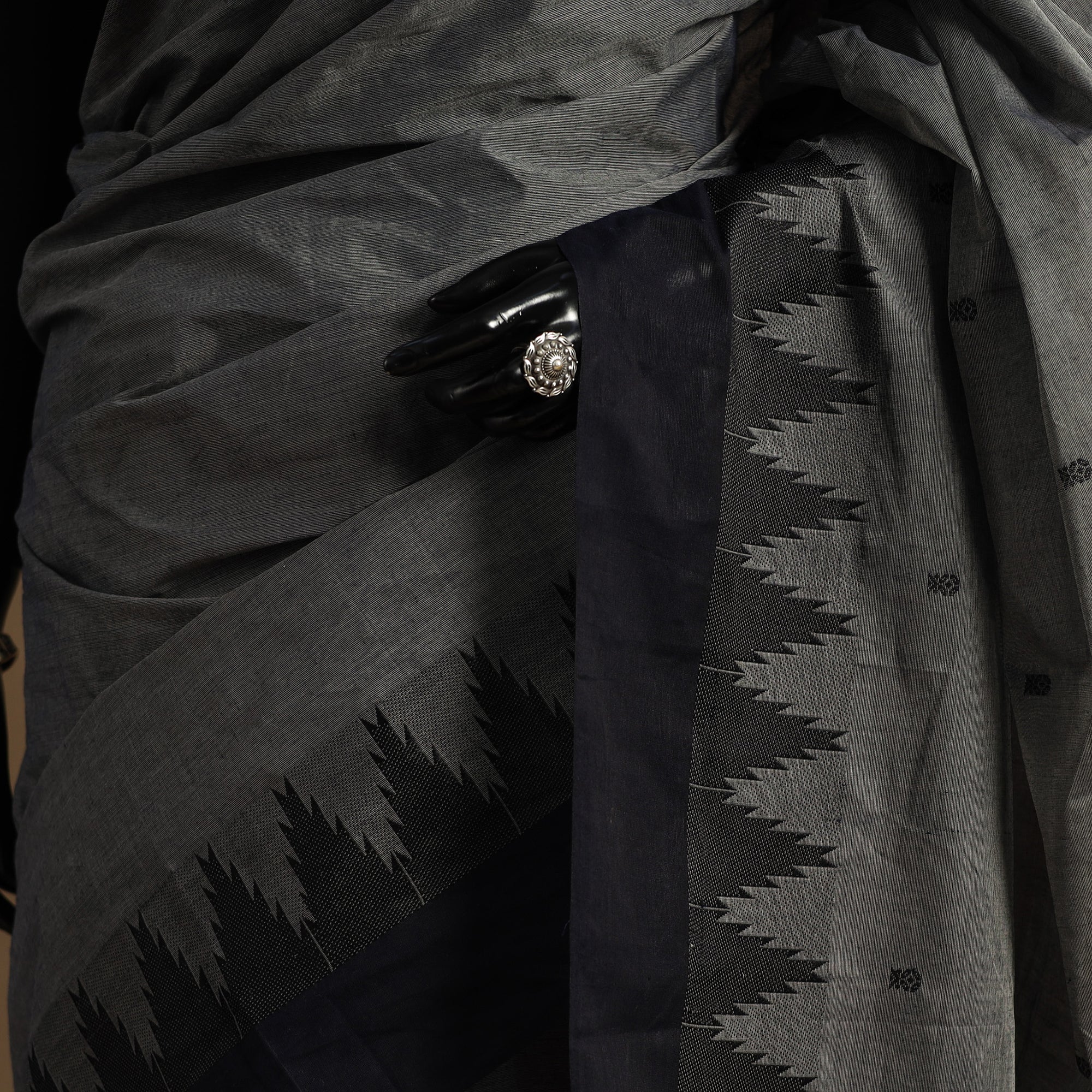 This grey chettinad cotton saree reflects the rich textile legacy of Tamil Nadu. Locally known as Kandangi, it showcases traditional weaving and a subtle border that adds elegance. Crafted from breathable cotton, it’s perfect for casual wear, office looks, or festive moments.