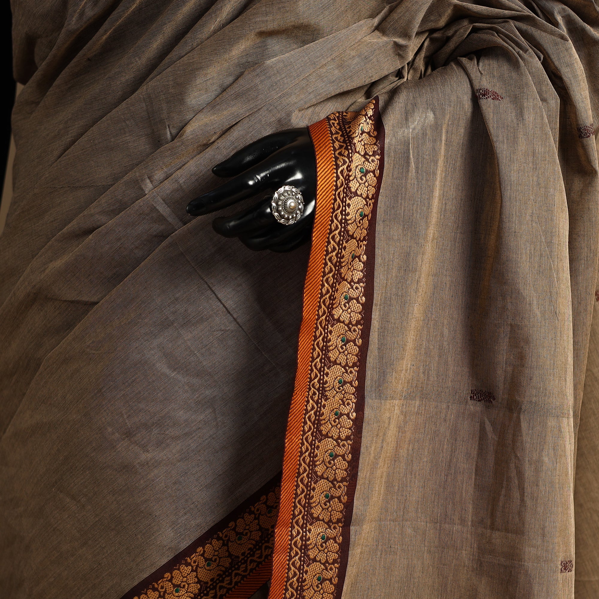 This brown chettinad cotton saree reflects the rich textile legacy of Tamil Nadu. Locally known as Kandangi, it showcases traditional weaving and a subtle border that adds elegance. Crafted from breathable cotton, it’s perfect for casual wear, office looks, or festive moments.