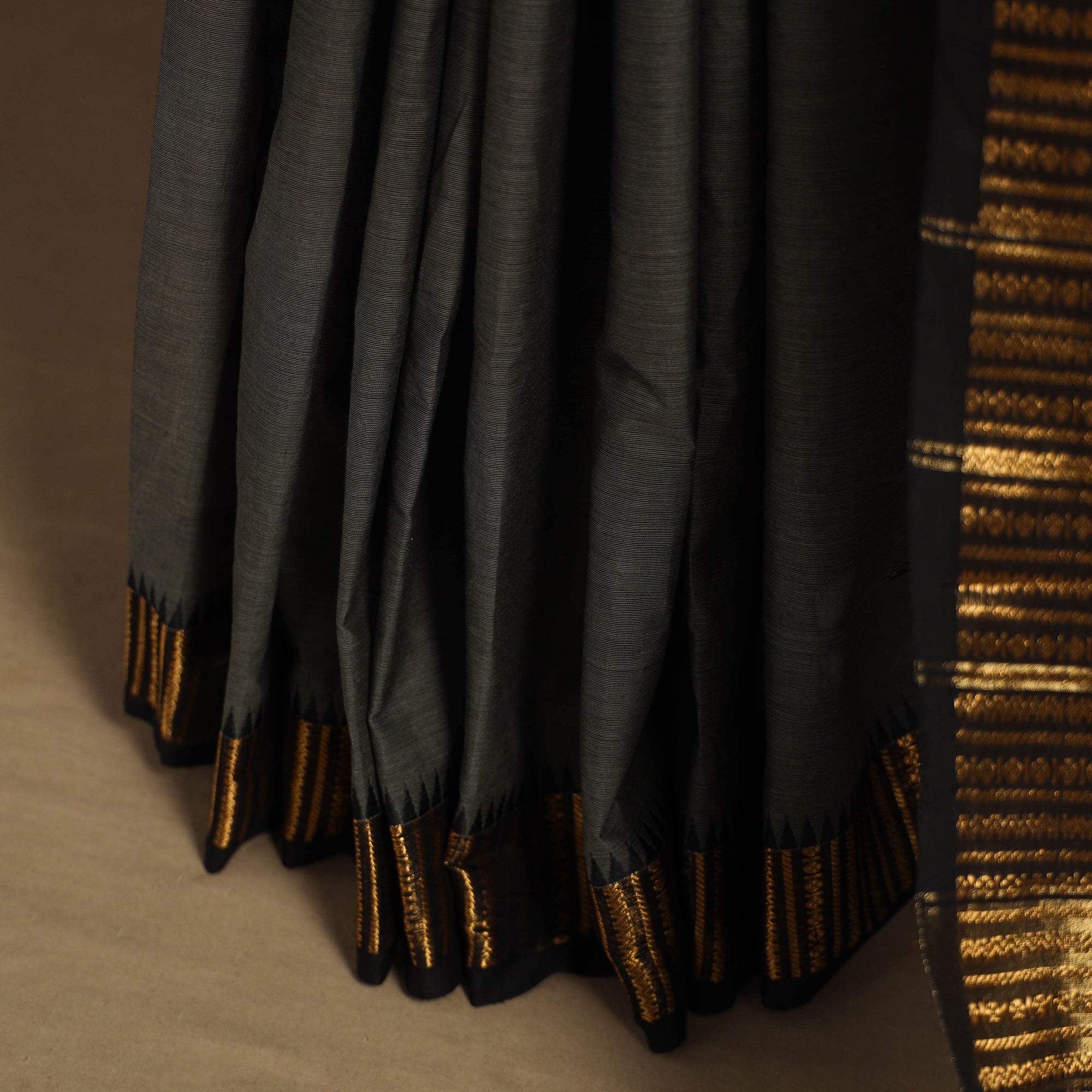 This traditional grey Chettinad saree reflects the rich textile heritage of Tamil Nadu. Also known as Kandangi, it features classic weaving patterns and a subtle border that enhances its grace. Woven in breathable cotton, it’s ideal for daily wear, office dressing, or festive occasions.