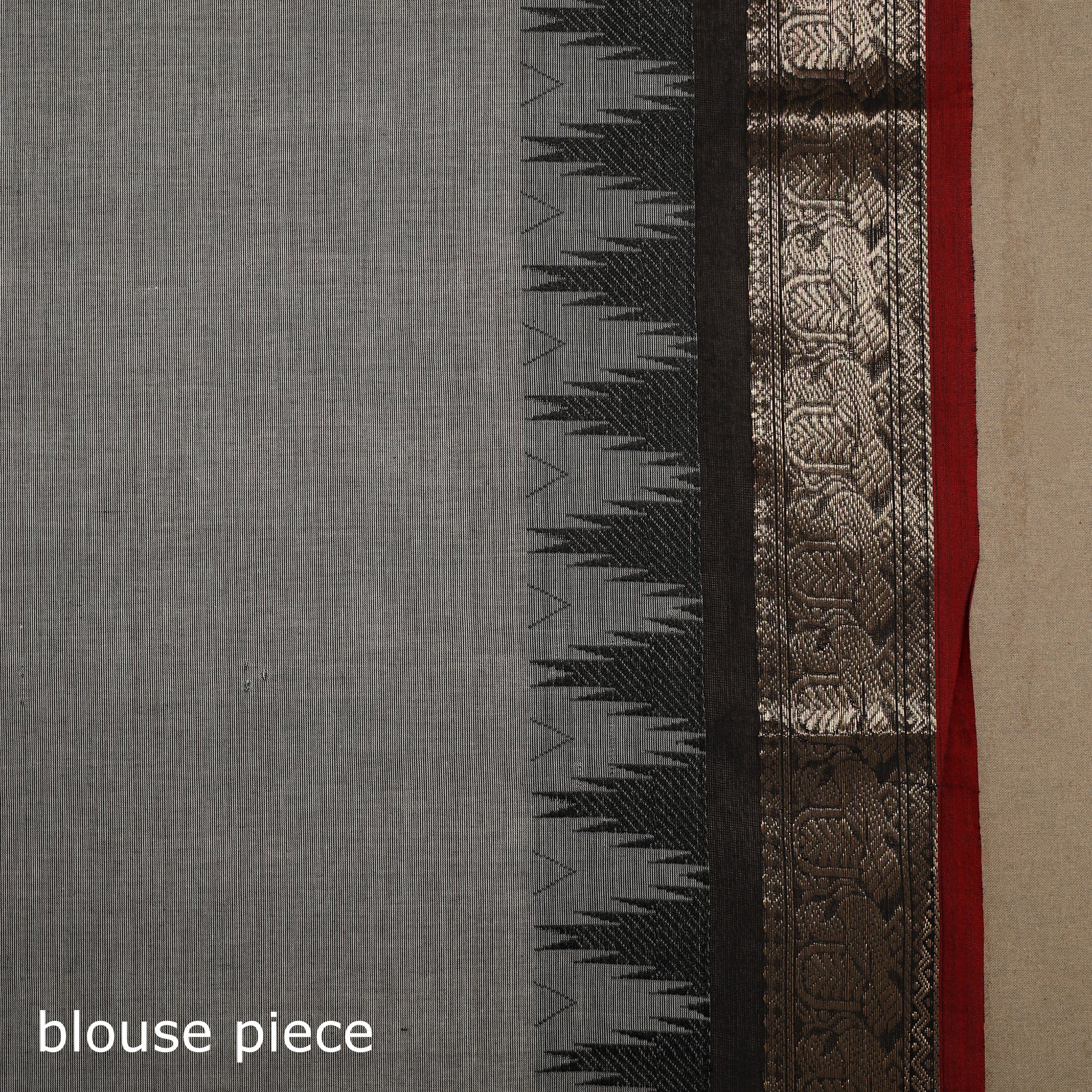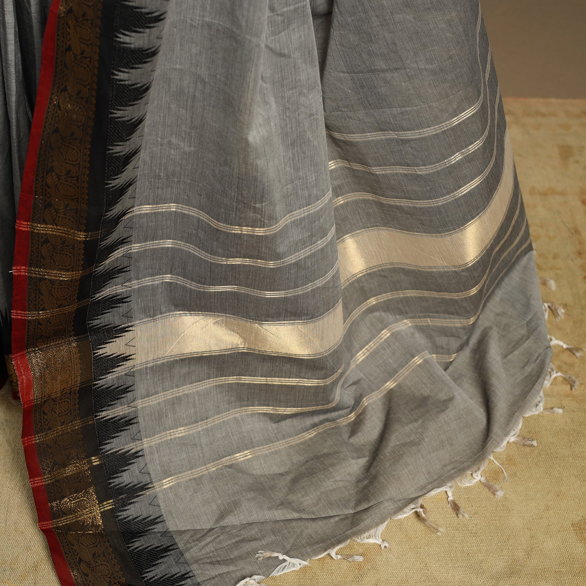 This grey chettinad cotton saree reflects the rich textile legacy of Tamil Nadu. Locally known as Kandangi, it showcases traditional weaving and a subtle border that adds elegance. Crafted from breathable cotton, it’s perfect for casual wear, office looks, or festive moments.