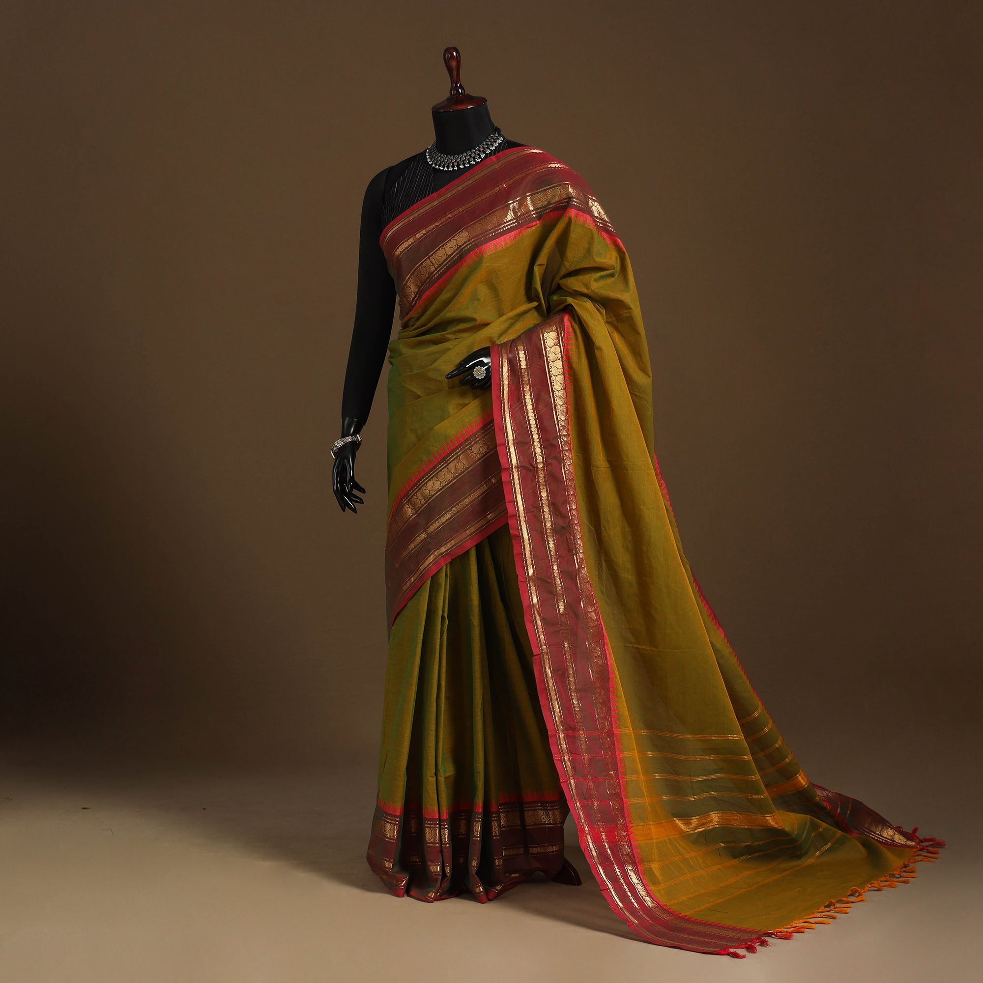 This traditional brown Chettinad saree reflects the rich textile heritage of Tamil Nadu. Also known as Kandangi, it features classic weaving patterns and a subtle border that enhances its grace. Woven in breathable cotton, it’s ideal for daily wear, office dressing, or festive occasions.