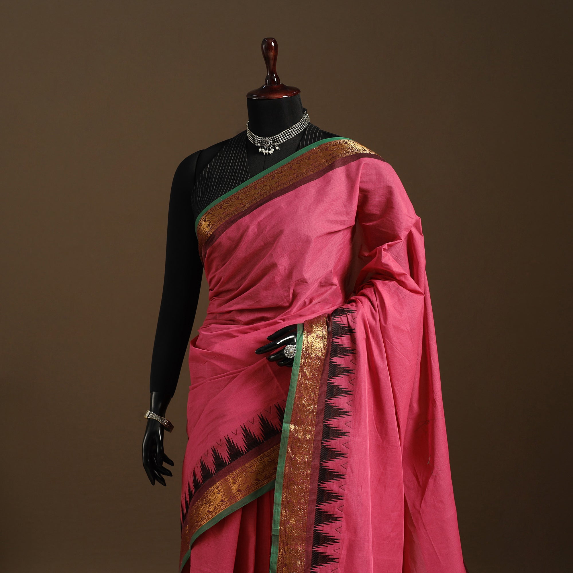This pink chettinad cotton saree reflects the rich textile legacy of Tamil Nadu. Locally known as Kandangi, it showcases traditional weaving and a subtle border that adds elegance. Crafted from breathable cotton, it’s perfect for casual wear, office looks, or festive moments.