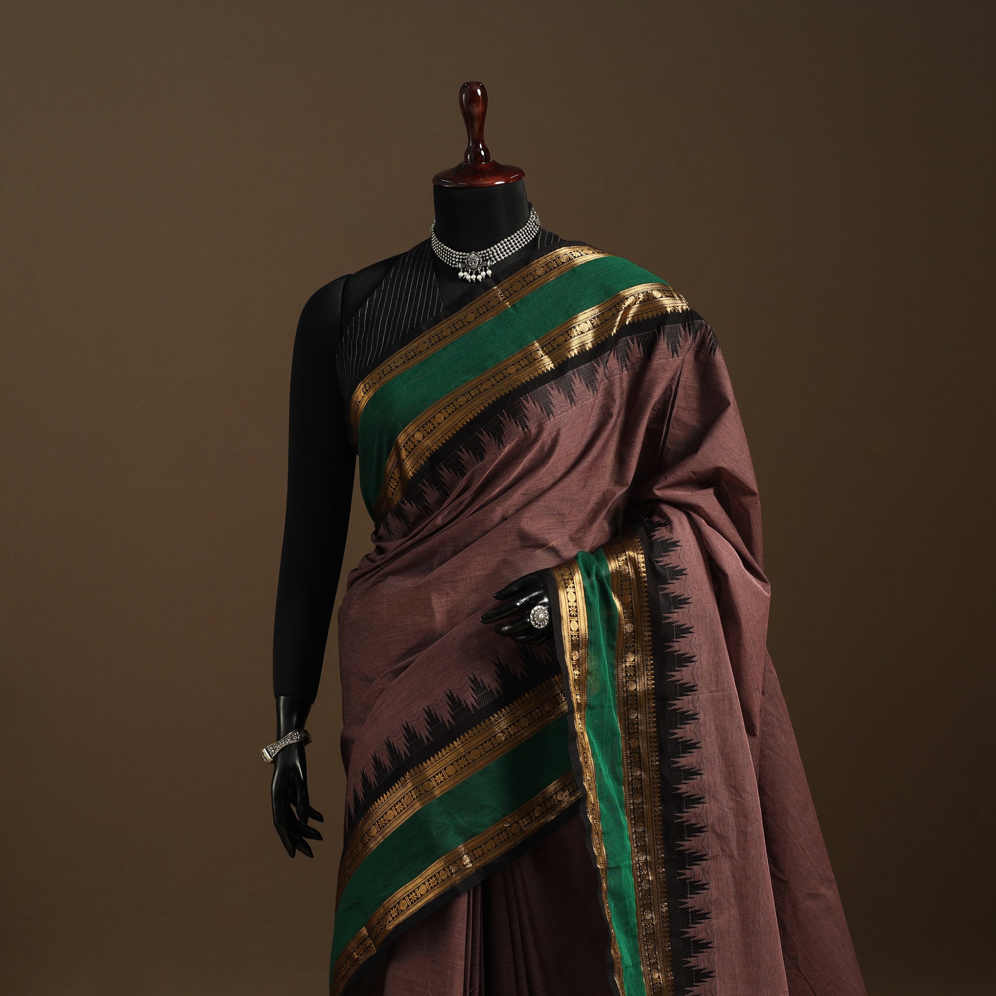 This brown chettinad cotton saree reflects the rich textile legacy of Tamil Nadu. Locally known as Kandangi, it showcases traditional weaving and a subtle border that adds elegance. Crafted from breathable cotton, it’s perfect for casual wear, office looks, or festive moments.