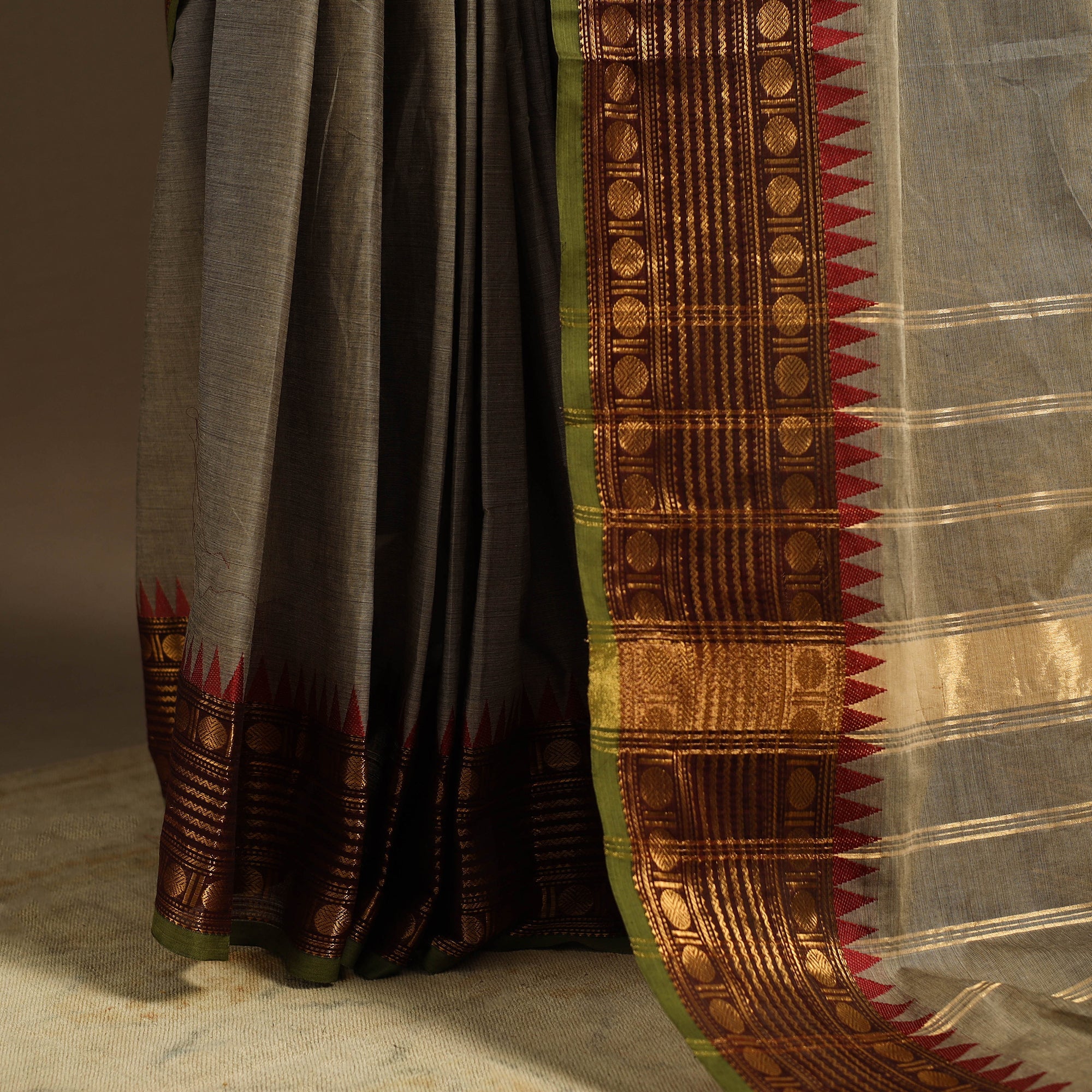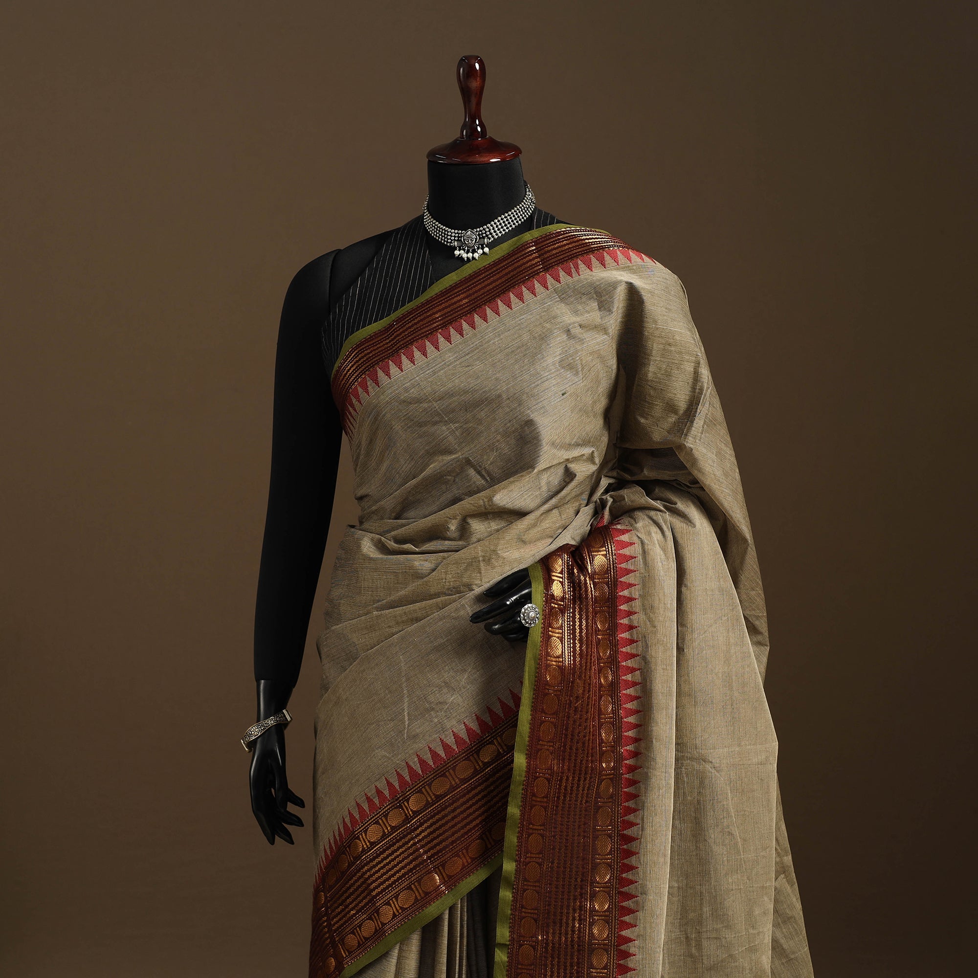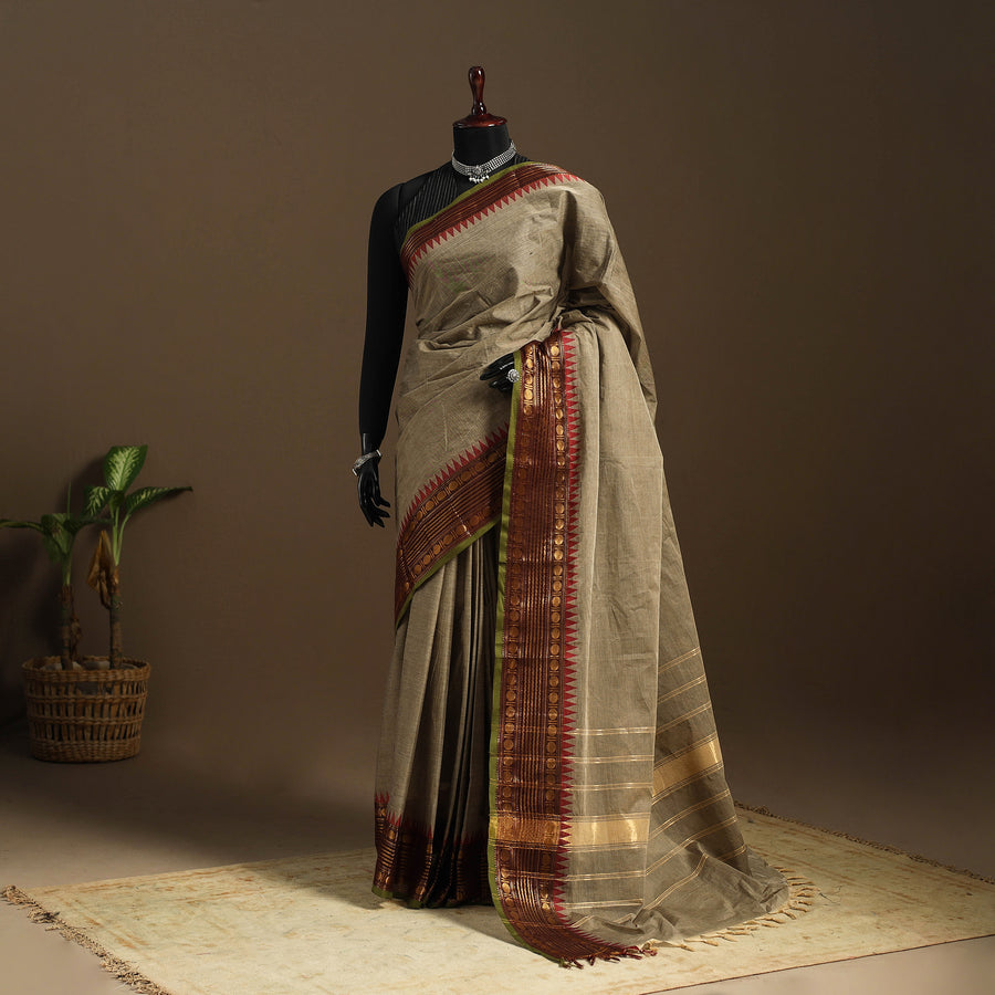 This brown chettinad cotton saree reflects the rich textile legacy of Tamil Nadu. Locally known as Kandangi, it showcases traditional weaving and a subtle border that adds elegance. Crafted from breathable cotton, it’s perfect for casual wear, office looks, or festive moments.