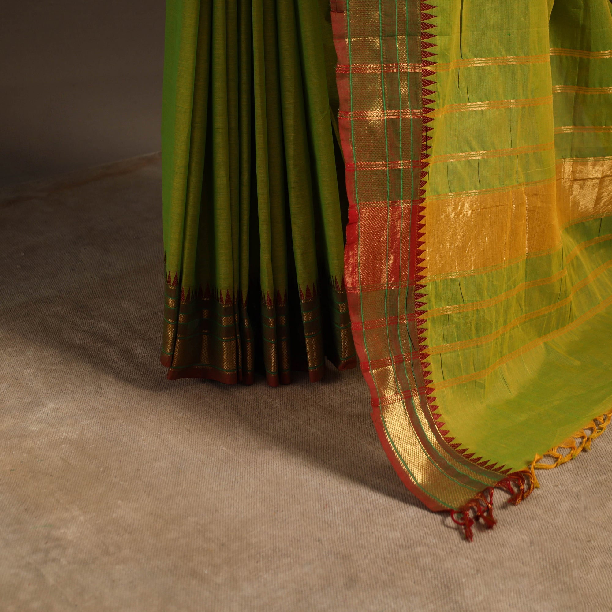 This green chettinad saree, also known as Kandangi, beautifully represents Tamil Nadu’s traditional weaving style. Made from soft, breathable cotton, it features elegant patterns and a graceful border that adds timeless charm. Perfect for everyday wear, office attire, or festive celebrations.
