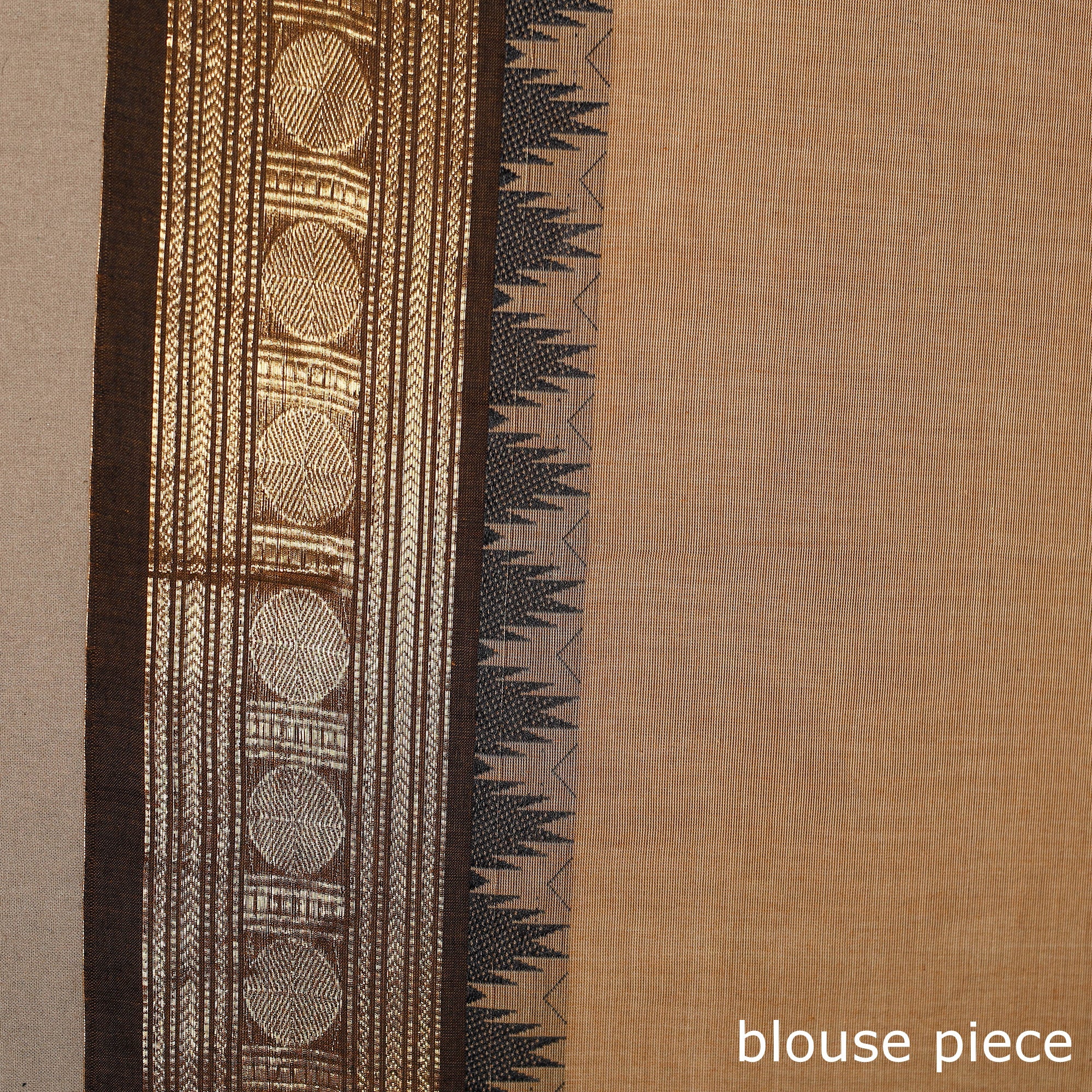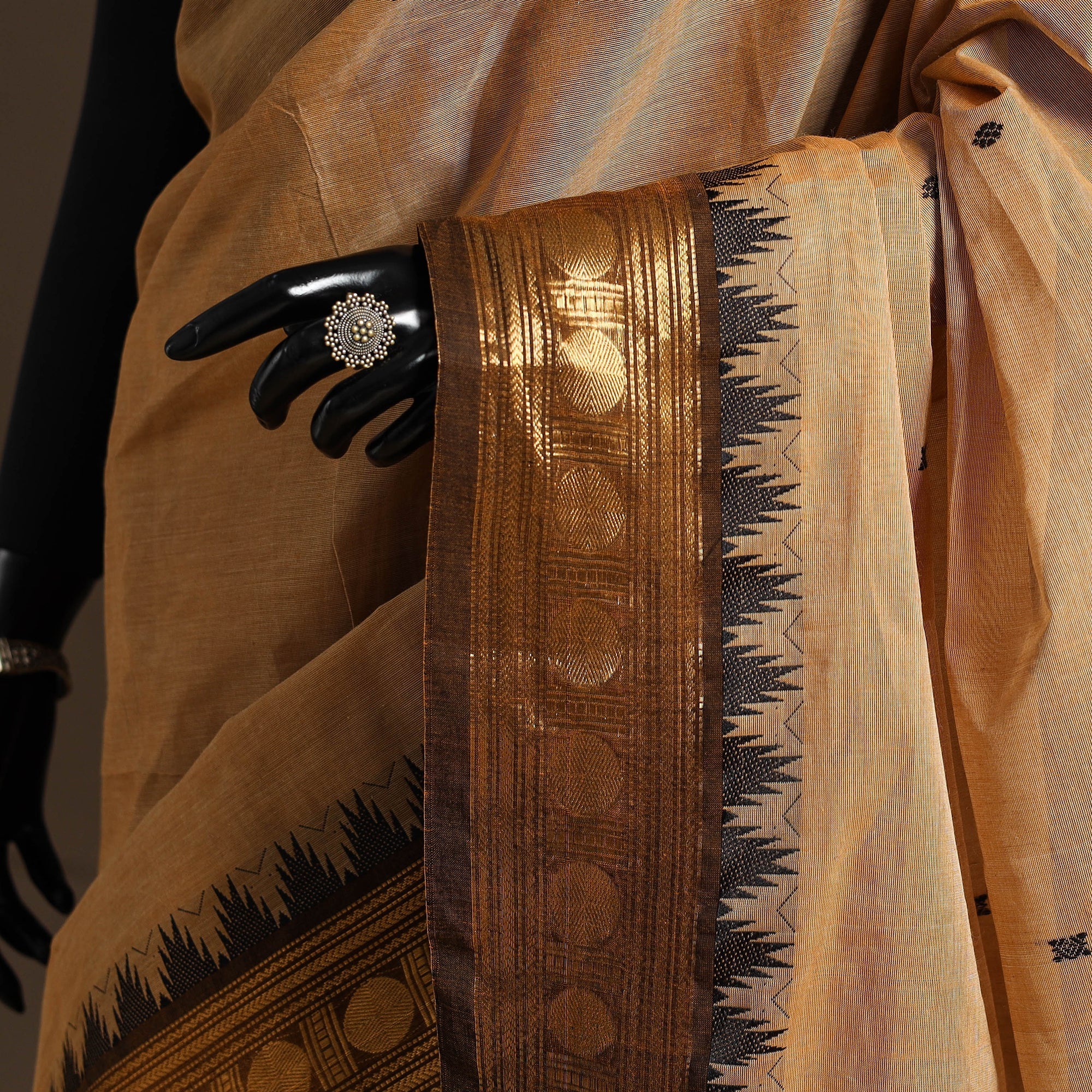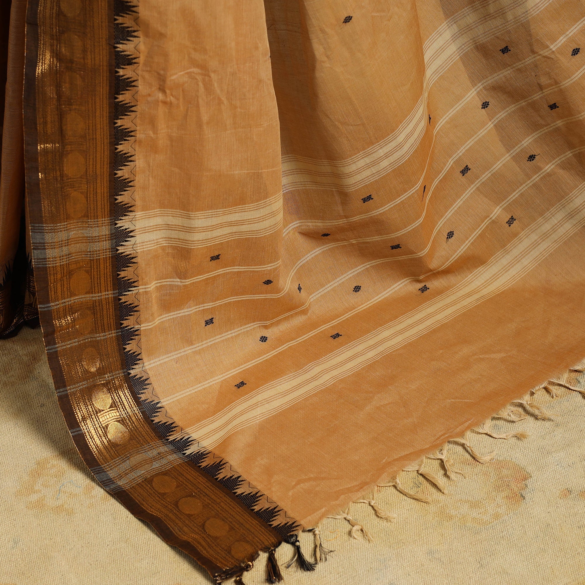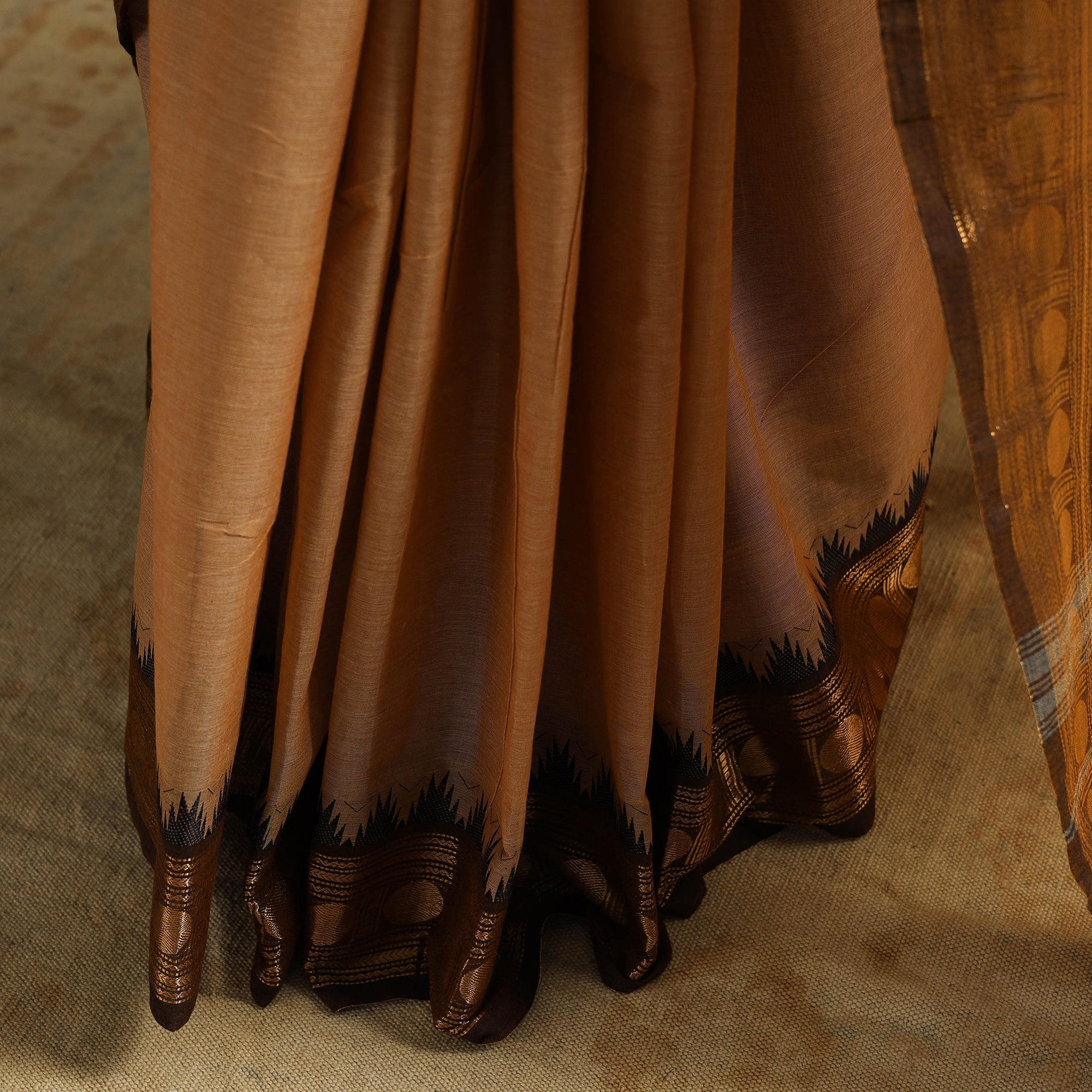 This brown chettinad cotton saree reflects the rich textile legacy of Tamil Nadu. Known locally as kandangi, it features traditional weaving, threaded buti work, and a subtle zari border that adds elegance. Crafted from breathable cotton, it's ideal for everyday wear, office attire, or festive occasions.