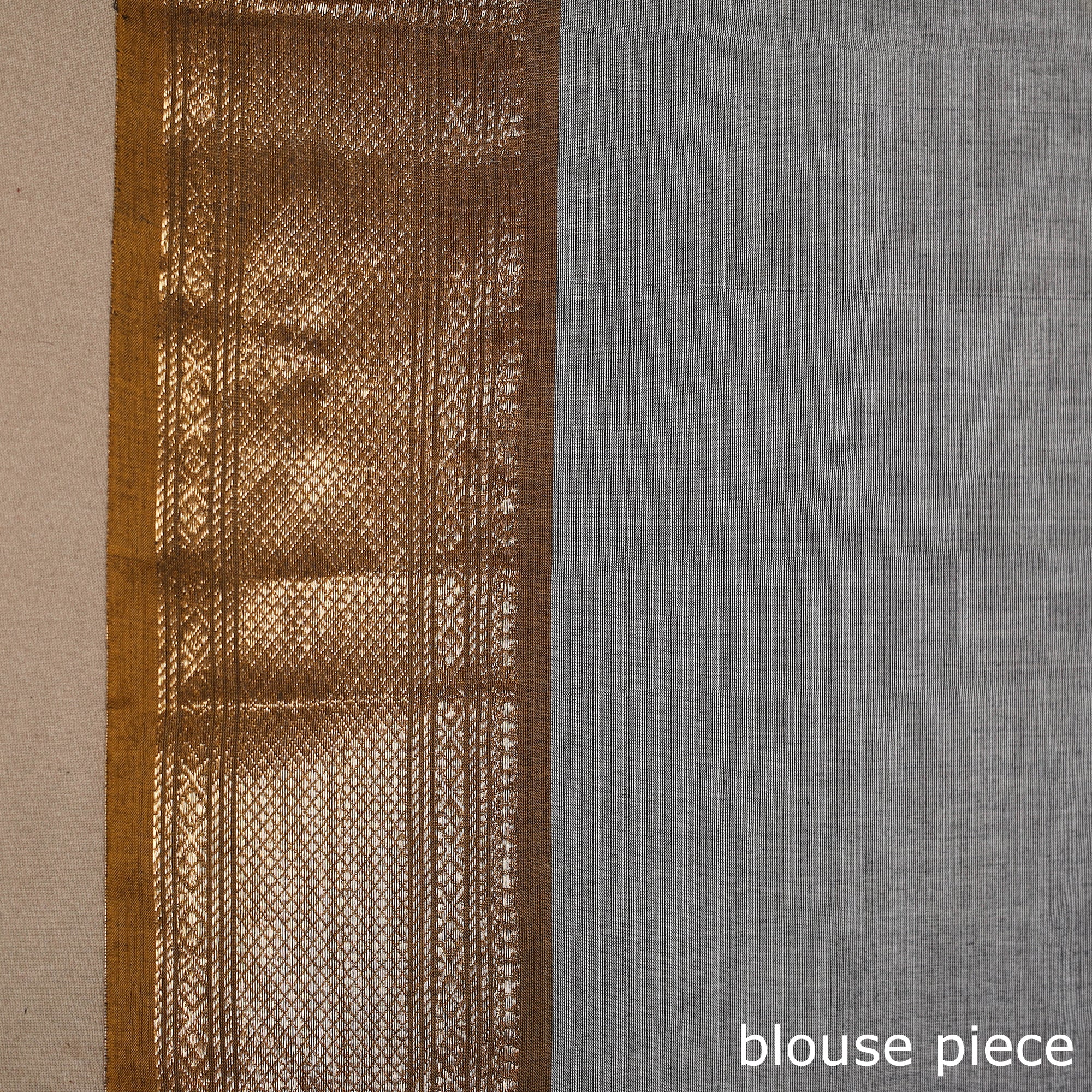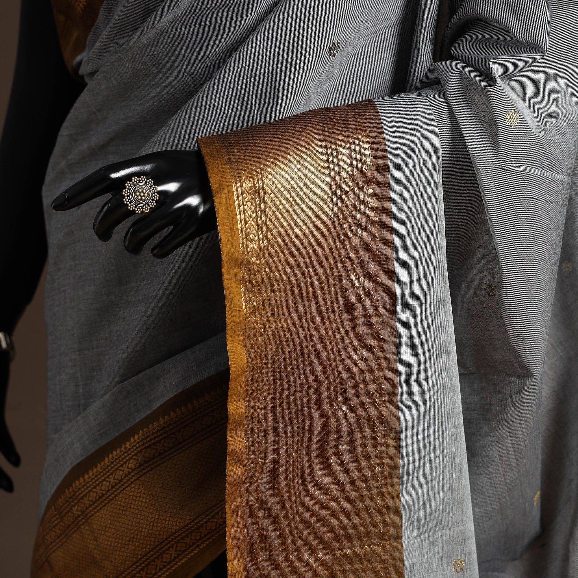This grey chettinad cotton saree reflects the rich textile legacy of Tamil Nadu. Known locally as kandangi, it features traditional weaving, threaded buti work, and a subtle zari border that adds elegance. Crafted from breathable cotton, it's ideal for everyday wear, office attire, or festive occasions.
