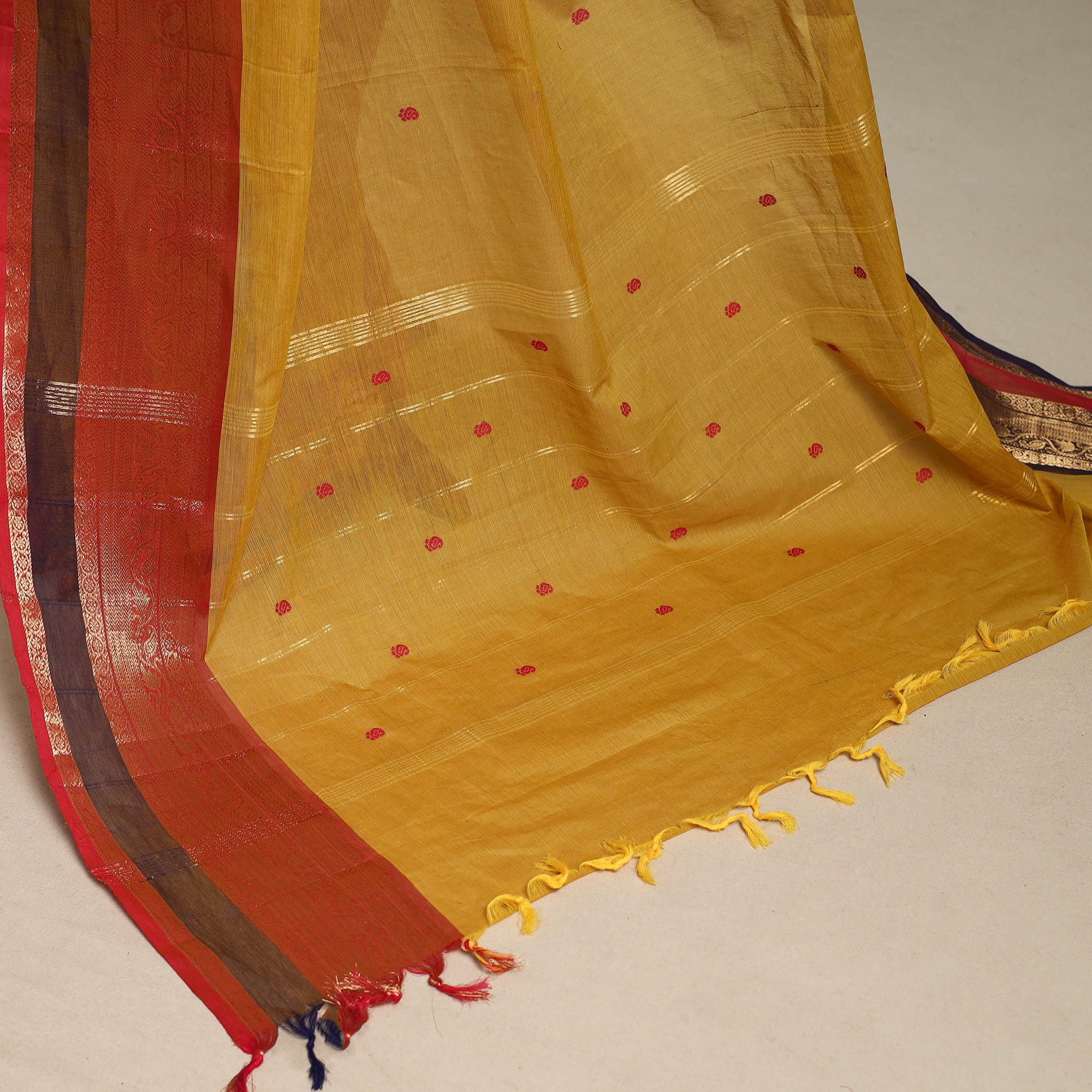 This yellow kandangi chettinad cotton saree beautifully reflects Tamil Nadu’s textile heritage. Featuring traditional weaving, delicate threaded buti work, and a subtle border, it blends elegance with comfort. Crafted from breathable cotton, it is perfect for daily wear, office outfits, or festive gatherings, offering a style that is both graceful and versatile.